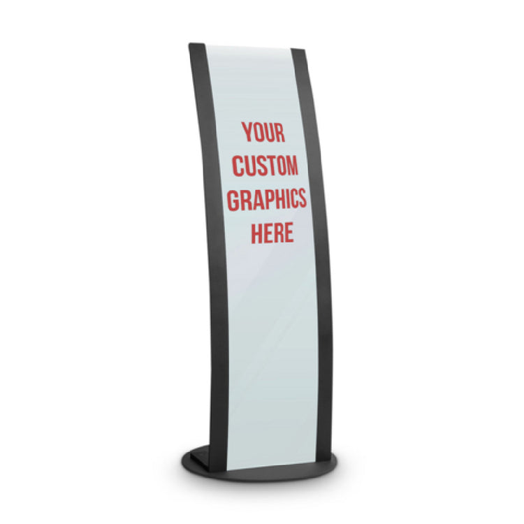 Forbes Industries, 2765, Curved Floor Sign, 12" x 50", Acrylic window with custom printed single-sided Sintra or paper graphics, Black powder-epoxy finished frame and base, 18" dia. base