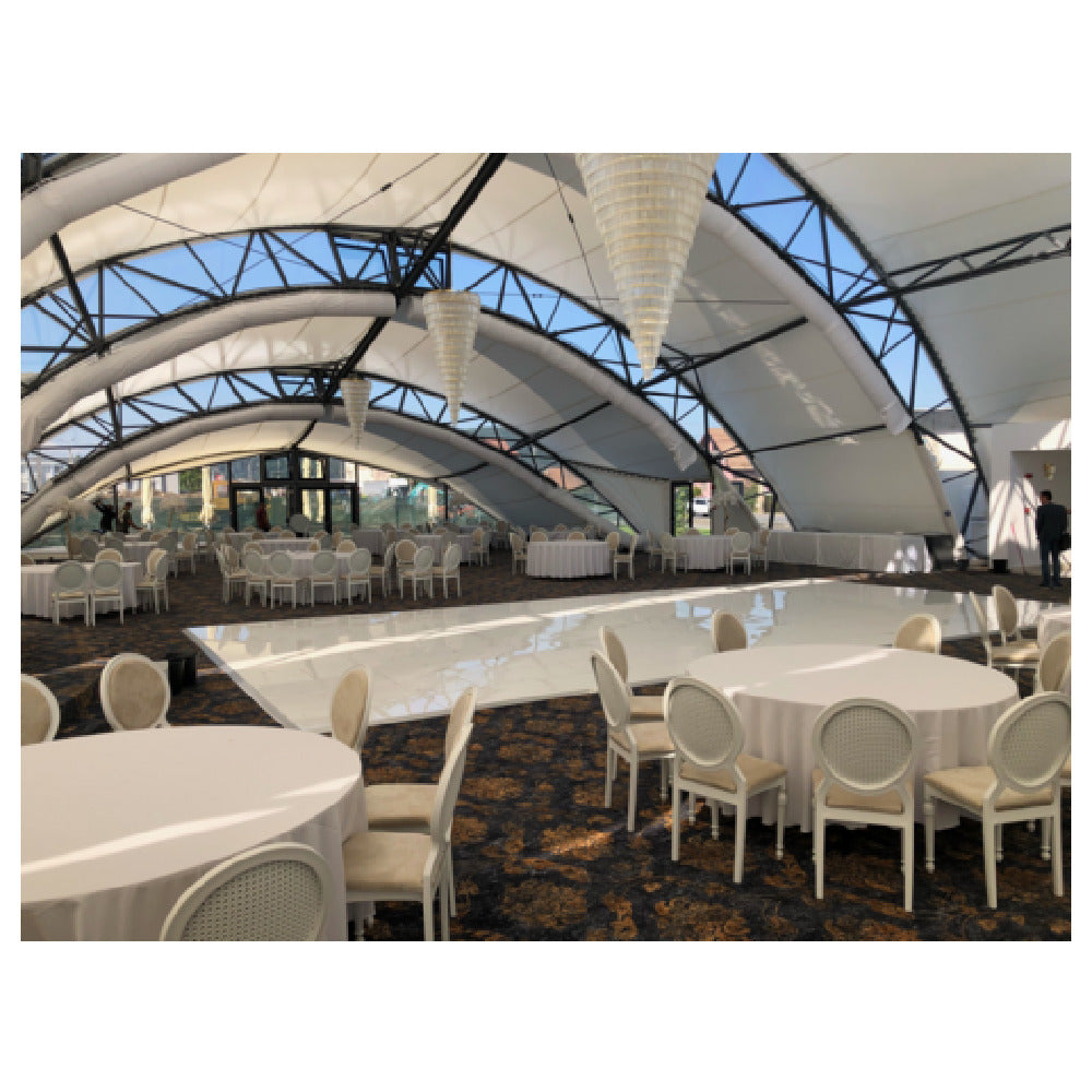 The Forbes Industries 3232WDK Wedlok® Portable Dance Floor Set 12' x 36' - 4" width trim is a versatile flooring solution designed for indoor use. This comprehensive dance floor set includes 45 full panels measuring 48" x 48" each and 18 half panels with dimensions of 48" x 24". Additionally, the set is equipped with 21 full edges, 4 half edges, and 2 left and 2 right corners, ensuring a complete and secure assembly. The dance floor features a white acrylic surface, providing a sleek and sophisticated aesthetic suitable for a variety of events. The frame is constructed from a combination of aluminum and plywood, offering durability and stability while maintaining ease of assembly and disassembly, making it ideal for both temporary and permanent installations. The Forbes Industries Wedlok® system is designed to cater to diverse market segments such as event planners, hospitality venues, and corporate functions, providing an adaptable and high-quality flooring solution that meets the demanding standards of the industry. This product's detailed configuration supports various layout options, tailored to the specific needs of each event, ensuring that the Forbes Industries 3232WDK dance floor remains a preferred choice for professional and elegant occasions.