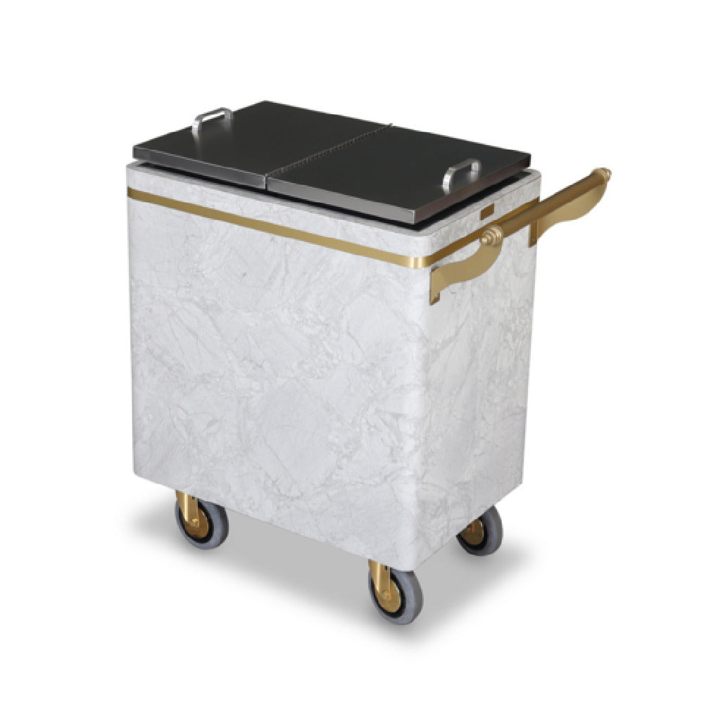 Forbes Industries, 4422, Deluxe Ice Restock Cart (insulated), 17.5"W x 32.25"D x 31.75"H, enclosed cabinet finished in HPL, insulated stainless steel interior with drain and lid, metal laminate accent strip, reeded push handle, 5” wheels in swivel casters, upgraded brass plated