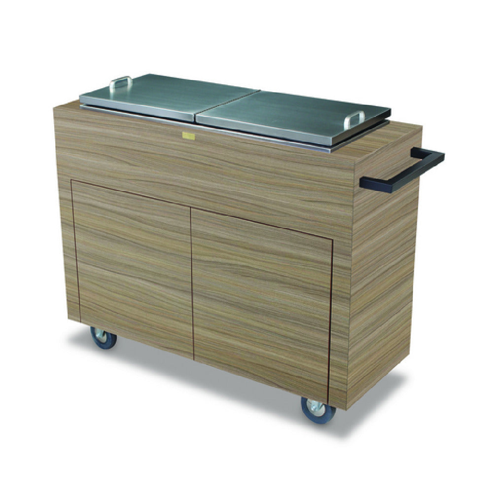 Forbes Industries, 4432, Ice Restock Cart, extra capacity (companion cart), 18"W x 51"D x 39.5" H, enclosed cabinet with two swing style doors finished in HPL, insulated stainless steel interior with drain and lid, square tube push handle, stainless steel lined interior for additional ice bucket storage, 5” wheels in swivel casters