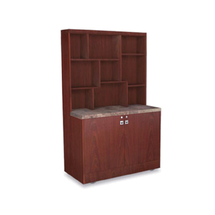 The Forbes Industries 4437 Modular Mobile Back Bar - 48"W x 24"D x 78"H - is a sophisticated addition to any hospitality or event setting. Featuring a striking Himalayan slate counter-top, this mobile back bar combines elegance with functionality. The mahogany laminate exterior provides a classic and rich appearance, enhancing the bar's overall aesthetic appeal. Designed with versatility in mind, this unit includes two locking doors that provide secure storage for bar essentials, ensuring ease of access and organization. Equipped with 4" wheels in zinc-plated swivel casters, the Forbes Industries 4437 offers effortless mobility, allowing for seamless transitions between various locations or events. Whether used in hotel lobbies, catering services, or upscale restaurants, the durable construction and stylish design of this modular mobile back bar make it an ideal choice for professionals seeking a reliable and attractive beverage service solution. The harmonious blend of practical features and elegant design elements ensures that the Forbes Industries 4437 Modular Mobile Back Bar not only meets but exceeds the demands of diverse market segments within the hospitality industry.