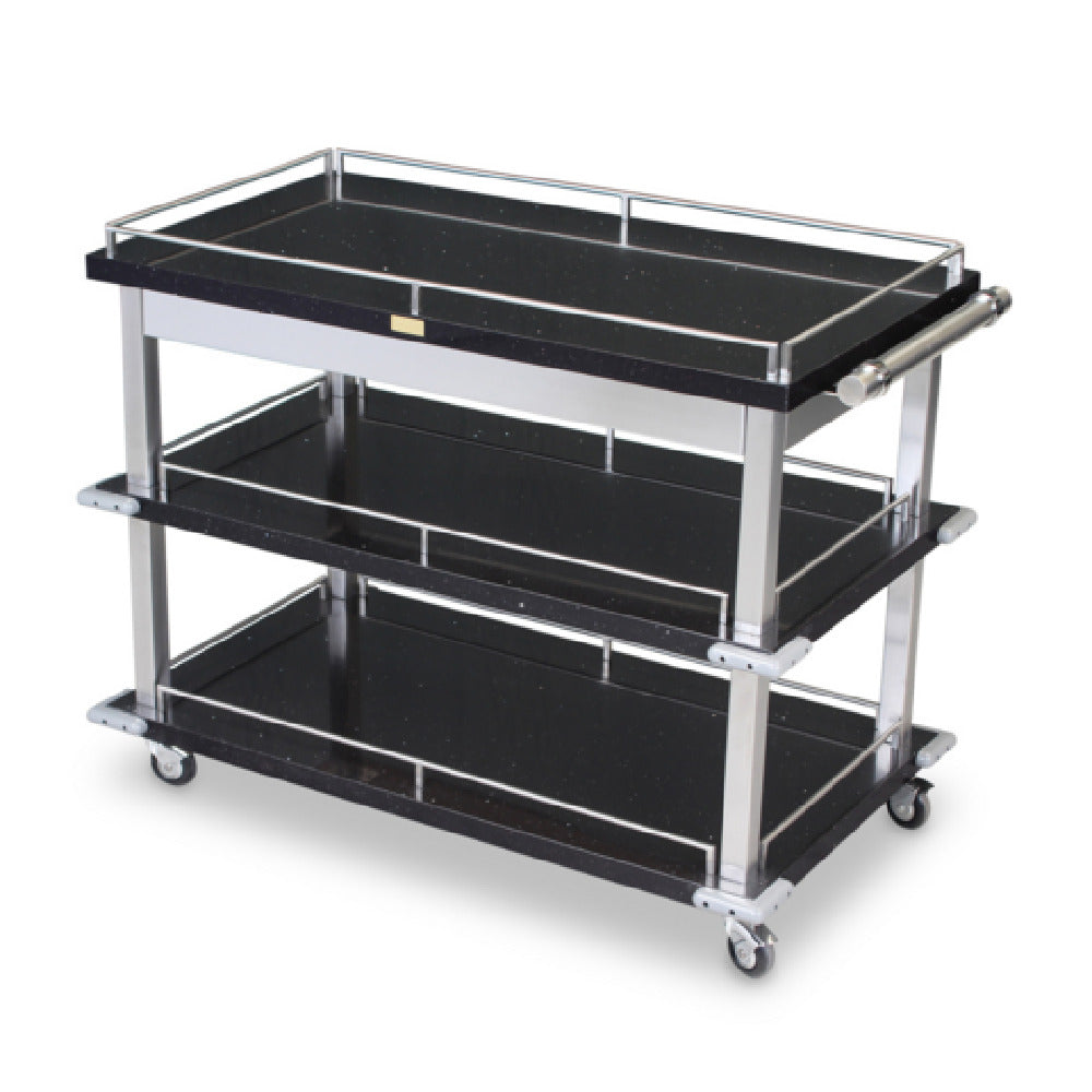 Forbes Industries, 5516, Deluxe Service Cart, 24.75"Wx 46.25"L x 33.75"H, stainless steel square legs, open, three Terrazzo shelves, four sided stainless steel gallery rails on all shelves, four fixed corner bumpers on both middle and bottom shelves, all 3" wheels in swivel casters (two with brakes). Overall Dimensions: