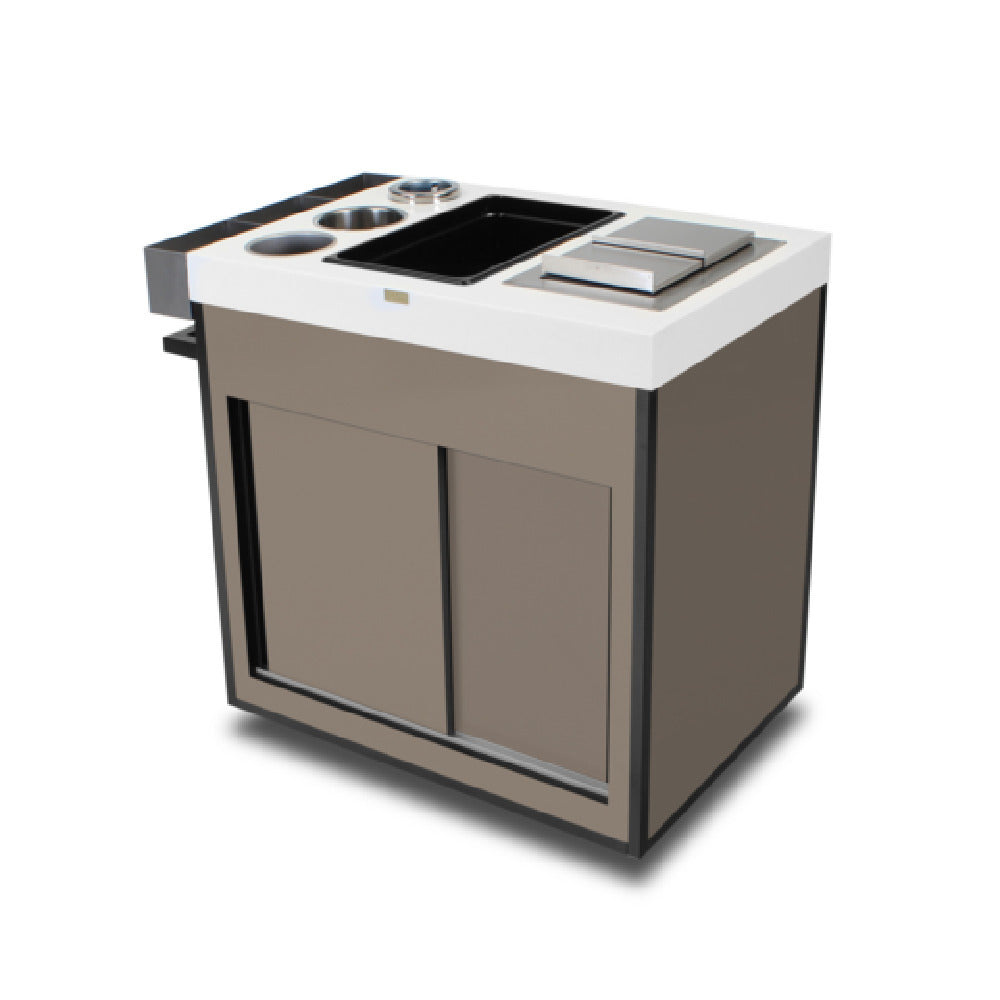 Forbes Industries, 5570, Champagne Cart, 26"Wx 44"L x 40"H, enclosed cabinet finished in HPL, Avonite work surface, powder-epoxy painted frame, stainless steel speed rail with three sections, cup dispenser for 12-28oz cups, stainless steel Bain Marie, trash chute, plastic food pan, one fixed shelf and two sliding doors, 5" wheels in all swivel casters. Overall Dimension:
