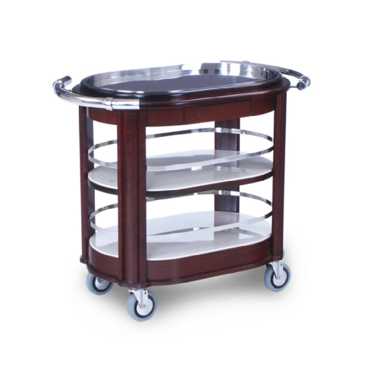 Forbes Industries, 5743, Champagne Cart, 28"Wx 41"L x 33"H, open with two shelves, solid wood top with polished stainless steel lining and recessed Avonite inlay, wood veneer and solid wood construction, two polished stainless steel curved handles, pull-out shelf, polished stainless steel gallery rails, 5" wheels in swivel casters