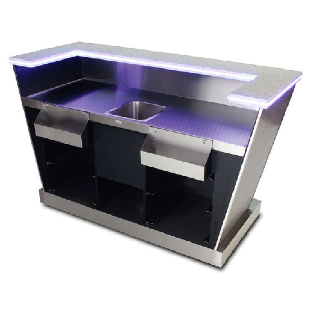 The Forbes Industries 5783-6 Alchemy Mobile Bar is a meticulously crafted piece, measuring 33 inches in width, 80-1/4 inches in length, and 47-1/2 inches in height, with a bar length of 6 feet. Its tapered wood veneer cabinet exudes elegance and durability, while the "U" shaped Avonite countertop is designed for both style and functionality. This mobile bar features decorative stainless steel punch panels on the front corners, enhancing its sophisticated aesthetic. The stainless steel working countertop offers a robust surface for preparation and service. Inside, the bar provides a black laminated interior with two open sections, each equipped with three sets of glass rack rails. A stainless steel sink with a drain and two 18-inch speed rails enhance its practicality, making it a versatile choice for various settings. The 5-inch grey wheels with swivel casters ensure easy mobility, allowing it to be conveniently positioned as needed. This product, shown with optional LED lighting on the serving edge counter, is well-suited for use in hospitality venues, event spaces, and catering services, offering a unique combination of aesthetic appeal and practical functionality that meets diverse market needs within the industry.