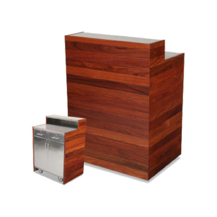 The Forbes Industries 5941 Host Station is a versatile and well-crafted unit designed for both outdoor and indoor settings. Measuring 34-1/2" wide, 26" deep, and 48-1/2" high, this host station is engineered to accommodate the needs of various hospitality environments. It combines the aesthetic appeal of tropical hardwood cladding with the durability of a stainless steel cabinet, making it both stylish and resilient. The Avonite top and riser add a touch of elegance and functionality, providing a smooth surface for operational needs. The host station is equipped with two stainless steel locking drawers and doors, ensuring secure storage of essential items. Additionally, it features four swivel casters, enhancing mobility and positioning flexibility. This construction makes it an ideal choice for environments requiring both stability and ease of movement, such as hotels, restaurants, and event venues. The Forbes Industries 5941 Host Station seamlessly integrates practical features with a refined design, catering to a diverse range of market segments within the hospitality industry.