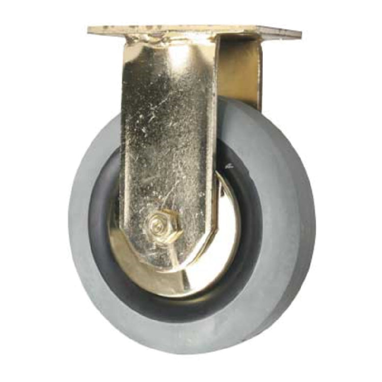 The Forbes Industries 6050-R Replacement Caster - 5" dia. Grey Non-marking Wheel (#6050-W) is engineered for stability and durability, making it indispensable for various industrial applications. This caster is designed with a 5-inch diameter grey non-marking wheel, ensuring it leaves no unsightly marks on floors, which is essential for maintaining pristine surfaces in environments such as hospitals, hotels, and clean rooms. The wheel is brass plated, providing an elegant finish that complements the aesthetic of high-end carts and equipment. Its rigid design ensures a fixed path of movement, which is ideal for applications that require straight-line precision. Equipped with threadguards, this caster effectively prevents debris from getting entangled in the wheel mechanism, thereby enhancing its longevity and reducing maintenance needs. The Forbes Industries 6050-R caster is an excellent choice for industries that prioritize both functionality and appearance, offering a blend of aesthetic appeal and robust performance. Its design caters to different market segments, from hospitality to healthcare, by ensuring efficient movement while preserving the integrity of the flooring. Whether for replacing existing casters or upgrading equipment, this product offers a reliable solution that balances form and function.