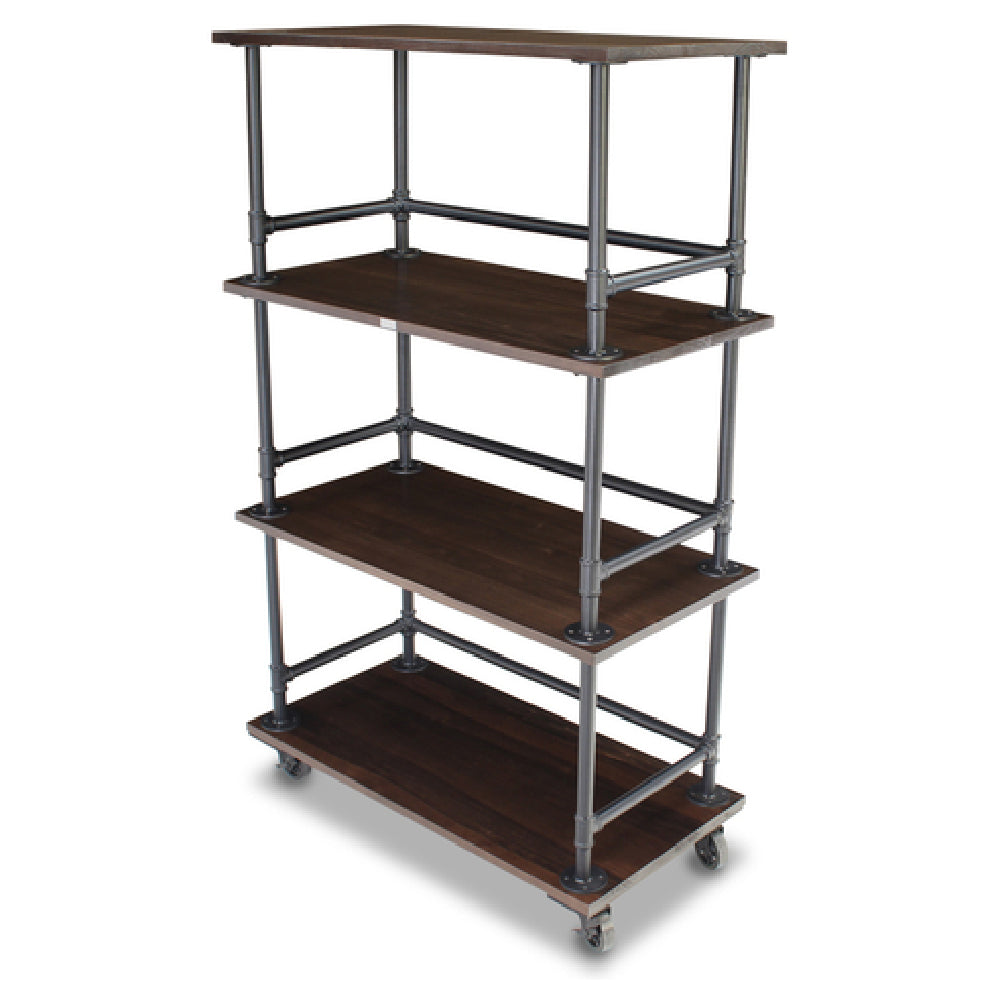 The Forbes Industries 6543-5 Rustica Series Rolling Display (Executive) is a versatile display unit measuring 60 inches in length, 24 inches in width, and 78 inches in height, designed to enhance both display capabilities and mobility. This rolling display features three rectangular galvanized steel shelves, each equipped with rails to ensure secure placement of items. The robust steel pipe frames are finished with a powder epoxy paint, allowing customization in color to match various aesthetic preferences. This unit is engineered for dynamic environments, thanks to its four all-swivel casters that allow easy maneuverability, with two of these casters equipped with brakes for stability. The cast wheels with polyurethane tread provide smooth rolling over most surfaces, making it an ideal choice for hotels, conference centers, and retail spaces that require a blend of functionality and style. The Forbes Industries 6543-5 Rustica Series Rolling Display is a practical solution designed to meet diverse industry needs, combining strength, convenience, and aesthetic flexibility.