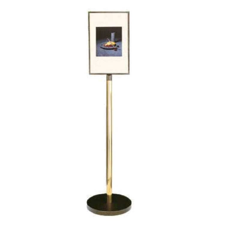 The Forbes Industries 6817 Poster Stand is a distinguished display solution featuring a 14" x 22" window and standing at 70" in height. This poster stand is crafted with a round brass post that not only provides a classic aesthetic appeal but also ensures durability and stability. It is equipped with a weighted base, enhancing its steadiness and preventing toppling in high-traffic areas. The structure is completed with a powder-epoxy painted frame and base, offering a sleek, polished finish that is resistant to wear and tear. Notably, the design excludes acrylic components, focusing on robust and long-lasting materials. Ideal for hotels, conference centers, and other professional settings, the Forbes Industries 6817 Poster Stand serves as an effective tool for showcasing important information, promotional content, or directional signage. Its combination of practical design and elegant materials makes it a valuable asset in environments where aesthetics and functionality are paramount.