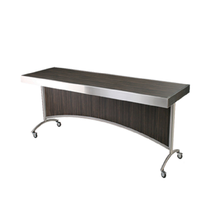 The Forbes Industries 7013-8 Mobile Table - 8 Feet Nestable is a meticulously engineered unit crafted to meet the diverse needs of various industry segments. This mobile table features a stainless steel framed laminate tabletop, providing a sturdy and reliable surface suitable for a range of applications. Its nestable design offers convenient storage and space-saving capabilities, making it ideal for dynamic environments where flexibility is paramount. The table is equipped with a privacy panel featuring an elegant arch design, enhancing both functionality and aesthetics. Supporting this structure are stainless steel tube legs complemented by a curved support bar, ensuring stability and durability under various operational conditions. The inclusion of 3-inch chrome hooded black wheels facilitates effortless mobility, allowing the table to be easily repositioned across different spaces as required. It is important to note that induction is not available on this unit, highlighting its specific design focus and intended use scenarios. The Forbes Industries 7013-8 Mobile Table is a versatile asset, offering robust performance and adaptability, making it an excellent choice for settings that require both practicality and sophisticated design elements.