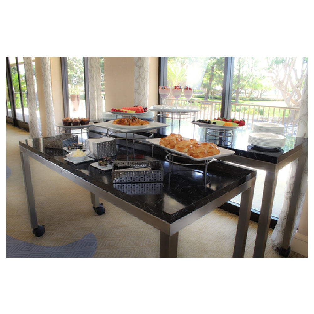 The Forbes Industries 7402 Claremont Series Nesting Tables (Essentials) exemplify versatility and functionality through their sophisticated design and robust construction, tailored for diverse professional environments. This set includes three meticulously crafted tables: a large table measuring 72"W x 30"D x 40-1/4"H, a medium table at 66"W x 30"D x 36-1/2"H, and a small table measuring 60"W x 30"D x 32-1/2"H. Each table is constructed with durable 2" square powder epoxy painted steel tube frames, providing a sturdy foundation. The high-pressure laminate tops add an elegant touch while ensuring resilience against daily wear and tear. Mobility is enhanced with 4" swivel casters, two of which come with brakes, facilitating easy repositioning and secure placement. These nesting tables cater to various market segments, including hospitality, event management, and corporate settings, offering space-saving solutions without compromising on style or performance. The thoughtful design and quality materials make the Forbes Industries 7402 Claremont Series Nesting Tables a strategic addition to any professional space, providing a balance of aesthetics and practical utility that meets the demands of dynamic work environments.