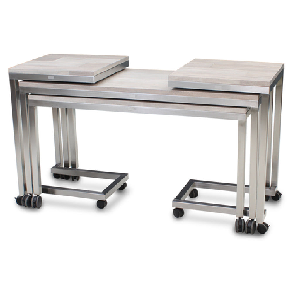 Forbes Industries 7408 Claremont Series Nesting Tables (Elite) is a versatile and stylish furniture solution that caters to various industry needs, particularly in hospitality and corporate environments. This set includes three tables - a large 72"W x 30"W x 40-1/4"H rectangle, a medium 66"W x 30"D x 36-1/2"H rectangle, and a small 60"W x 30"D x 32-1/2"H table. Each table is constructed with a brushed stainless steel tube frame featuring 2" square dimensions, ensuring robust durability and modern aesthetics. The Acacia wood tops add a touch of elegance, with customizable finishes to suit different decors. Equipped with 4" swivel casters, two of which include brakes, these tables offer mobility and stability, making them ideal for dynamic spaces that require frequent reconfiguration. The thoughtful nesting design allows for efficient storage and space management. Whether used for events, meetings, or dining, the Forbes Industries 7408 Claremont Series Nesting Tables provide a practical and attractive solution with their high-quality materials and adaptable functionality.