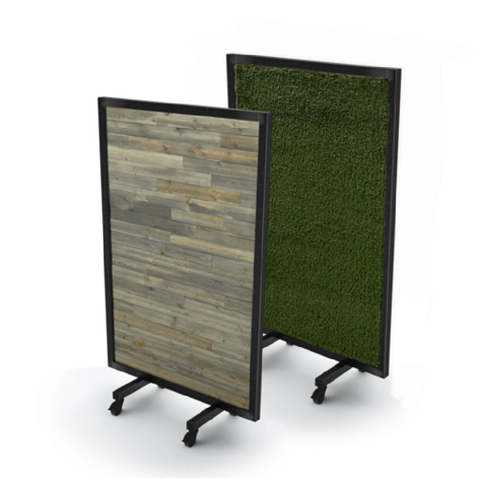 Forbes Industries, 7831, Pivot Mobile Partition 4-ft Panel, 48"L x 21.75"W x 78"H open, 48"L x 2"W x 78"H folded, finished with Vermont Grey Shiplap on one side and Faux Grass on the other, brushed steel frame with clear powder-epoxy coating, (2) pivoting legs with (4) swivel casters, easy shipping and storage.