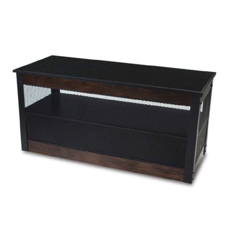 - Three-sided cabinet finished in wood veneer and metal mesh exterior