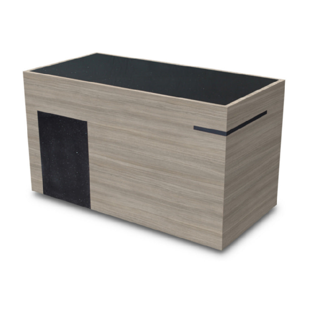Forbes Industries, F30-5174, Live Action & Buffet Station body only, 72”L x 30"W x 36”H, three-sided cabinet finished in HPL, decorative countertop material and metal accents on front and sides, Terrazzo countertop, stainless steel trim and frame, middle and bottom shelves are finished with HPL, 5” wheels in swivel casters, concealed