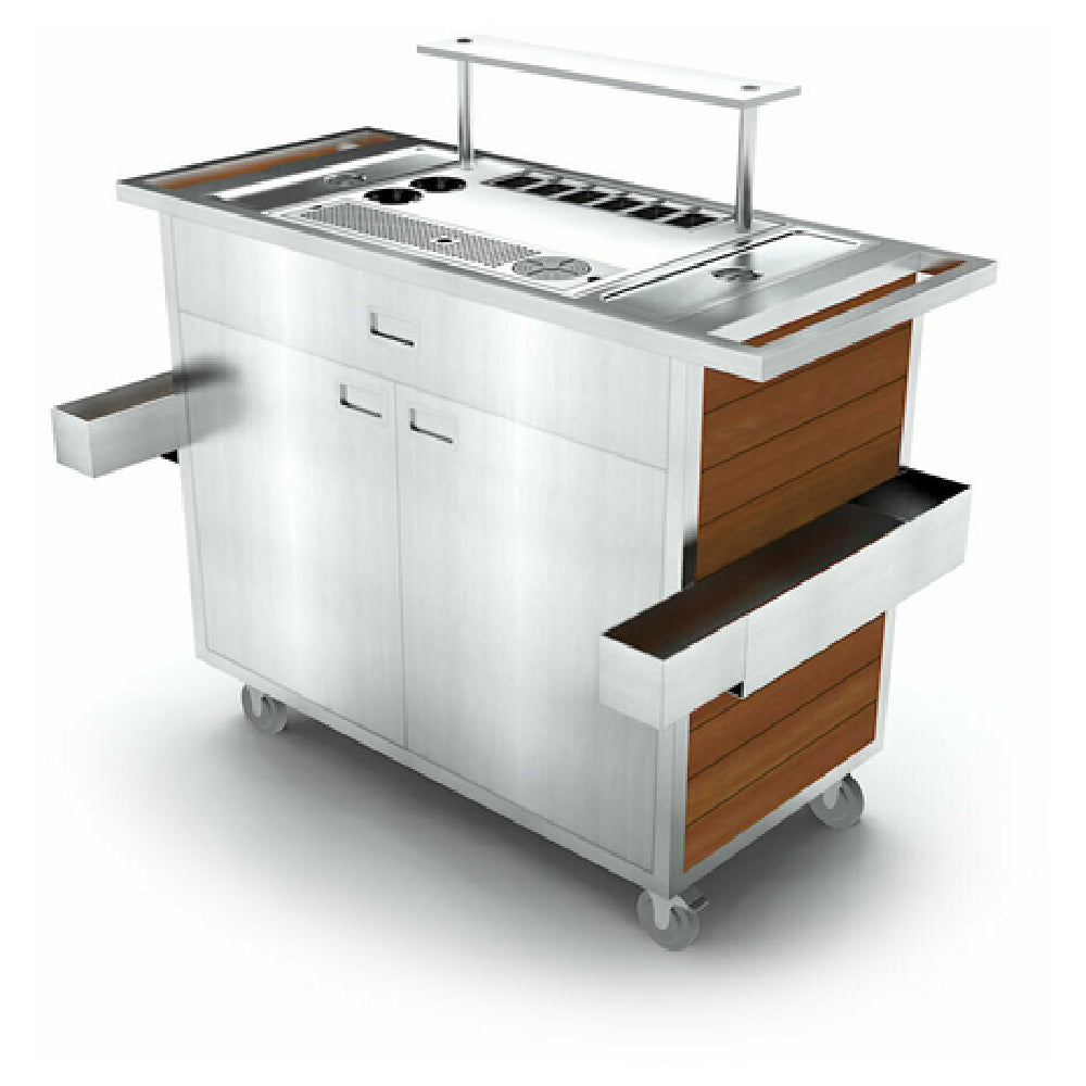 The Forbes Industries F35-5567 Mixology Cart Tropical Elite 58"L X 24"W X 39"H is a meticulously crafted solution for professional mixologists and upscale hospitality venues. Featuring a polyethylene work surface labeled "C" and a luxurious tropical hardwood finish, this cart stands out for its durability and aesthetic appeal. The brushed stainless steel tube frame ensures structural integrity, complemented by two removable speed rails for efficient service. With push handles and 4" diameter rustic look wheels, including two with brakes, mobility is seamless. The cart is equipped with perimeter gallery rails on the middle and base shelves, providing secure storage. Two customizable ice compartments, a stainless steel drip tray, and a built-in condiment station with a condiment tray are included to enhance functionality. A flip-out amenity drawer and adjustable glass dividers on the center shelf offer additional versatility. The drink presentation platform and glass rinser elevate the beverage service experience. For organized storage, the cart features a fully enclosed stainless steel cabinet with two pocket doors and built-in Mixology tool storage. This mixology cart is designed to cater to the needs of high-end bars, luxury hotels, and exclusive event spaces, providing a comprehensive and elegant solution for beverage service excellence.