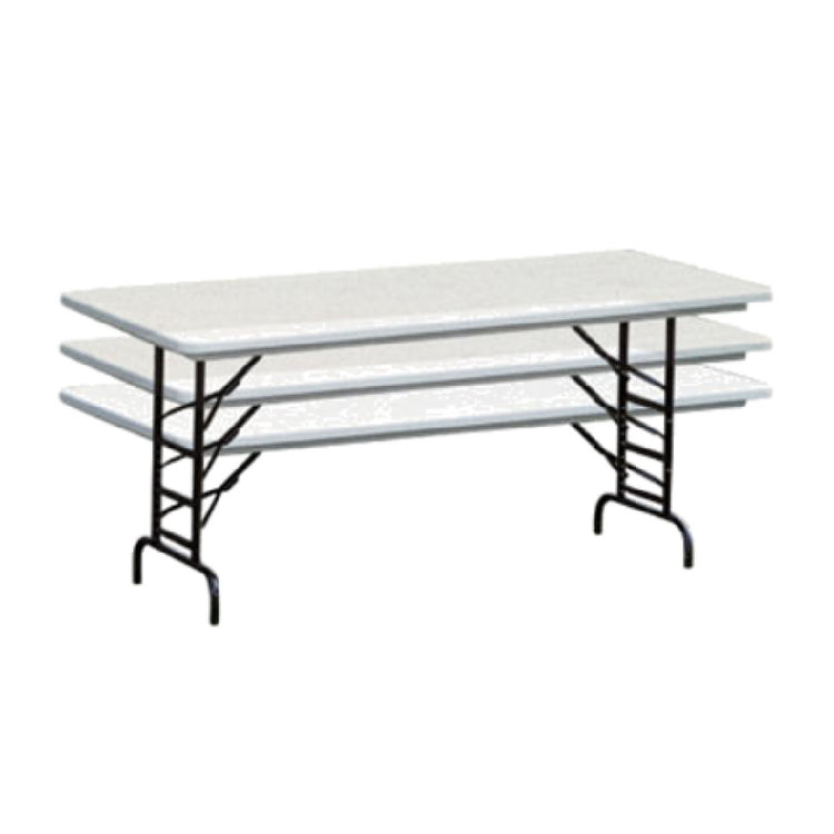 The Forbes Industries PT3096-AD POLYlite® Banquet Folding Table Rectangular 30" X 96" stands out in the hospitality industry with its practical and adaptable design. This rectangular table measures 30 inches by 96 inches and features a height-adjustable range from 22 inches to 32 inches, offering versatility to accommodate various event settings. Its lightweight construction is attributed to a polyethylene surface, ensuring ease of transport and setup. The table's 1-1/4 inch edge provides durability, while a steel frame with welded cross braces enhances stability, making it a reliable choice for high-traffic environments. The pedestal style folding legs, constructed from 18 gauge 1 inch diameter round steel tubing, boast a powder coat finish for added resilience against wear and tear. A gravity lock mechanism ensures the table remains securely in place during use. Non-marking plastic caps protect flooring surfaces, making this table suitable for a variety of venues, from hotels to conference centers. With a minimum order quantity of four tables, or a $55.00 pallet charge for orders of three or fewer, this product is geared towards larger scale operations seeking efficient and durable event furniture solutions.
