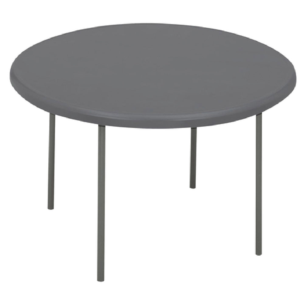The Forbes Industries RS48RDCC-CC Resilient IndestrucTableTOOSeries Folding Table is a versatile and durable option for various settings, including hospitality, conference, and event venues. This model features a round design with dimensions of 48 inches in diameter and 29 inches in height. Its 2-inch thick top is crafted from blow-molded high-density charcoal polyethylene, providing a lightweight yet robust surface that is washable and resistant to dents and scratches. The table's beveled edge adds a refined touch, making it suitable for both formal and casual environments. Supporting the table is a 1-inch tubular steel frame reinforced with bracing, ensuring stability and strength. The heavy-gauge gravity-lock steel legs further enhance its durability, and their powder-coated charcoal matte finish offers a sleek appearance. To protect flooring, the table is equipped with non-marring plastic floor glides. Designed for practicality and longevity, the Forbes Industries RS48RDCC-CC folding table addresses the needs of different market segments by offering a reliable and resilient solution that can withstand frequent use. With an estimated lead time of 2-3 weeks, this table is a dependable choice for those seeking a high-quality folding table that combines functionality with sophisticated design.