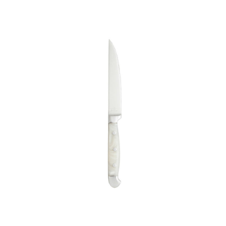 Fortessa 1.5.STK.SR.273 Steak Knife 9.1" (22cm) Serrated is a specialized dining tool crafted to enhance the steak-eating experience. This knife features a serrated edge, optimizing cutting efficiency for various meats, ensuring a smooth and precise slice every time. Measuring 9.1 inches (22cm) in length, it provides a balanced grip and leverage for users, whether in a professional kitchen or at a home dining table. The knife is constructed from high-quality 18/10 stainless steel, offering exceptional durability and resistance to corrosion, which is particularly valuable in high-moisture environments. The pearl gray acrylic handle not only adds an aesthetic touch but also ensures a comfortable and secure grip, making it suitable for extended use without discomfort. Each knife weighs 0.25, reflecting its sturdy build without sacrificing maneuverability. Sold in cases of six, this knife is an ideal choice for restaurants aiming to maintain a consistent and professional table setting, as well as for individuals seeking high-quality culinary tools at home. The Fortessa 1.5.STK.SR.273 Steak Knife is designed to meet the demands of both casual and fine dining establishments, combining functionality with an elegant design that complements any tableware collection.