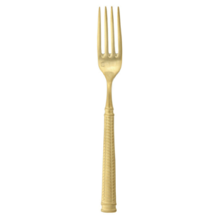 Fortessa 1.9B.134.00.012 Salad Fork 7.1" (18.1cm) Brushed is a refined piece of tableware crafted from premium 18/10 stainless steel, ensuring both durability and a sophisticated aesthetic. This salad fork, part of the Vivi collection, features a brushed gold finish that adds a touch of elegance to any dining setting. Measuring 7.1 inches (18.1 cm) in length, it is designed to offer optimal balance and comfort for the user. Each fork weighs 0.07 units, reflecting its lightweight yet sturdy construction. This product is available in cases of 12, catering to both individual consumers and large-scale dining establishments. Its high-quality materials and manufacturing make it ideal for use in upscale restaurants, catering services, or for enhancing personal dining experiences at home. The Fortessa salad fork represents a blend of functional design and artistic flair, embodying the brand's commitment to superior tableware solutions. Its timeless style and practicality provide an exquisite dining experience, appealing to a wide range of culinary environments that value both form and function in their dinnerware selections.