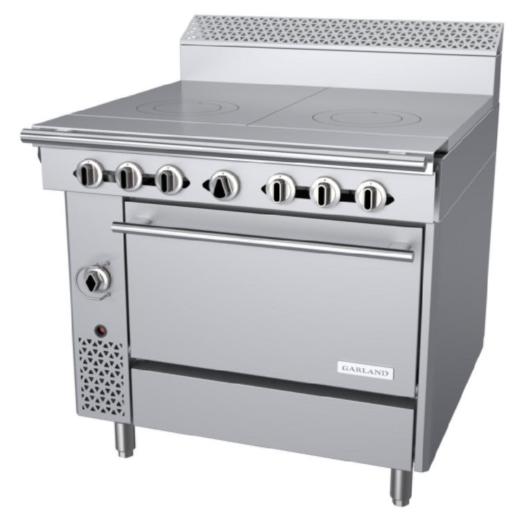 The Garland C36-10R Garland Cuisine Series Heavy Duty Range Gas is a robust and versatile 36-inch cooking solution engineered for high-demand commercial kitchens. Featuring dual 18-inch front-fired hot tops with removable lids and rings, this range allows for high-efficiency cooking and easy cleaning. The unit is equipped with a standard oven and comes with one rack, providing ample space for various cooking applications. The oven's efficient heat retention complements the cooktop's high-performance capabilities. A 7-inch backguard ensures safety and cleanliness by preventing spills and splashes from reaching the wall. Constructed with a stainless steel front, sides, plate rail, and burner box, the Garland C36-10R is designed for durability and longevity. It stands on 6-inch adjustable legs, offering flexibility in height and stability on uneven surfaces. With an output of 115,000 BTU, this gas range is built to meet the rigorous demands of a bustling kitchen environment. Its compliance with CSA Flame, CSA Star, and NSF standards ensures both safety and quality performance. The Garland C36-10R is an ideal choice for restaurants, catering services, and institutional kitchens that require a reliable, heavy-duty range to support their diverse culinary needs.