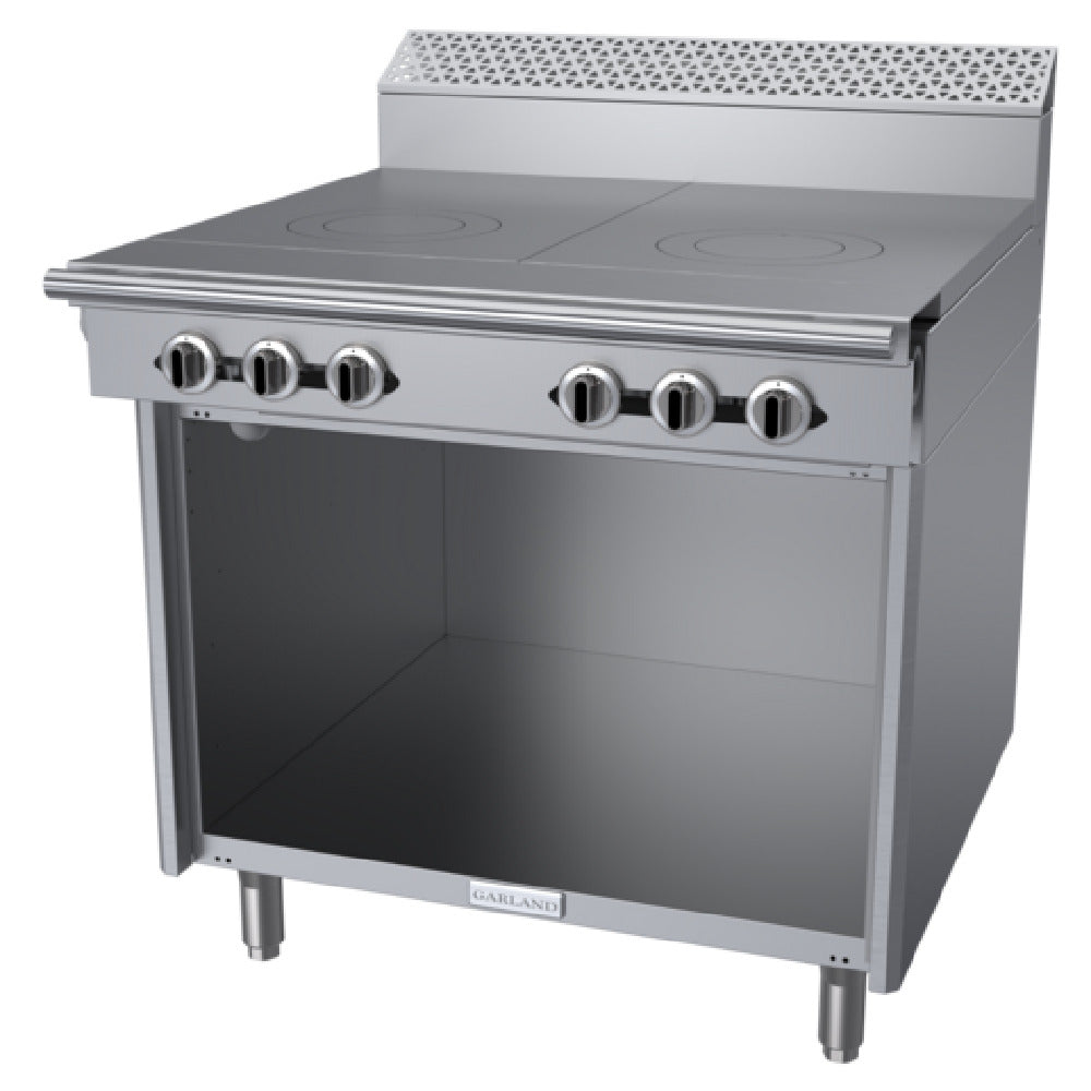 The Garland C36-10S Garland Cuisine Series Heavy Duty Range is a robust gas-powered cooking unit designed for demanding kitchen environments. With dimensions of 36 inches, this range is equipped with two 18-inch front-fired hot tops, providing ample cooking space for large-scale culinary operations. The hot tops feature removable lids and rings, allowing for versatile cooking techniques and easy maintenance. The open cabinet base offers additional storage space, enhancing kitchen efficiency. A 7-inch high backguard is included, adding an extra layer of safety and protection to kitchen walls from heat and splatter. The range is constructed with a stainless steel front, sides, plate rail, and burner box, ensuring durability and resistance to corrosion even in high-traffic kitchens. It stands on 6-inch adjustable legs, providing stability and the flexibility to adapt to varying kitchen setups. With a powerful output of 75,000 BTU, this range meets the rigorous demands of busy culinary establishments. Certified by CSA Flame, CSA Star, and NSF, the Garland C36-10S complies with stringent safety and sanitation standards, making it a reliable choice for professional chefs and kitchen operators who value performance and quality in every dish they prepare.
