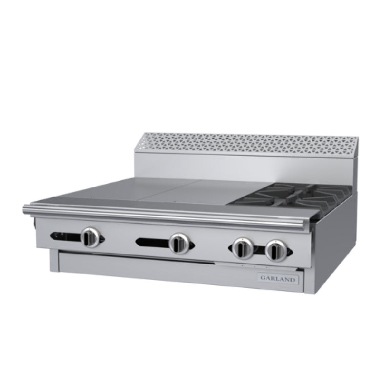 The Garland C36-12M Garland Cuisine Series Heavy Duty Range Gas is a versatile modular top unit, measuring 36 inches in width, designed to meet the rigorous demands of professional kitchens. Equipped with two 35,000 BTU open burners, this range delivers powerful heat output for high-efficiency cooking. Additionally, it features two 12-inch even heat hot tops, ensuring consistent heat distribution for optimal culinary results. The range's 7-inch high backguard provides protection and ease of cleaning, while the durable stainless steel construction, encompassing the front, sides, plate rail, and burner box, ensures longevity and robustness. With a total output of 120,000 BTU using natural gas, this range is certified by CSA Flame, CSA Star, and NSF, confirming its adherence to stringent safety and quality standards. The Garland C36-12M is a practical choice for commercial kitchens seeking reliability and performance, catering to diverse market segments within the foodservice industry, including restaurants, catering businesses, and institutional kitchens.
