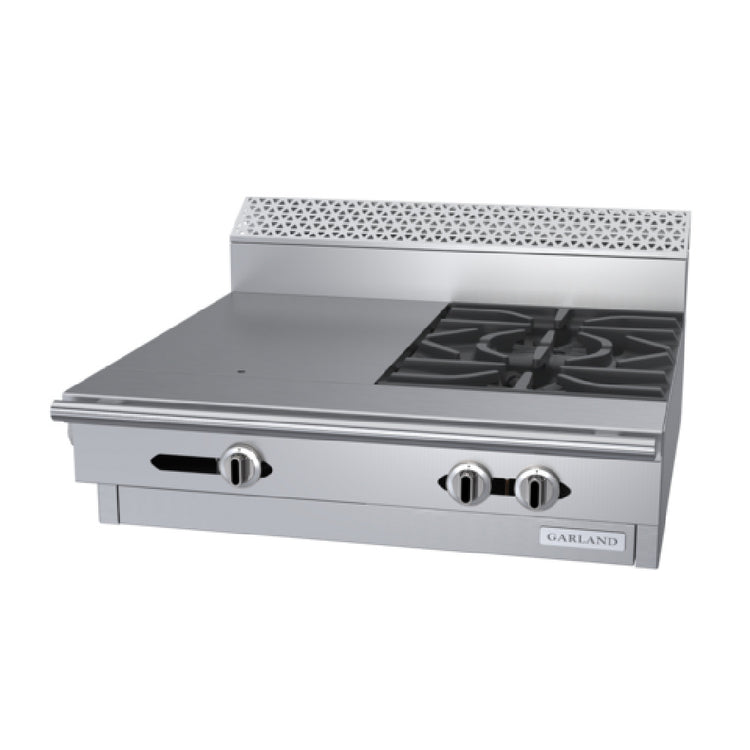 The Garland C36-14M Garland Cuisine Series Heavy Duty Range Gas is a versatile cooking solution designed for professional kitchens. This 36-inch modular top range is equipped with two powerful 40,000 BTU open burners, providing the high-heat capabilities necessary for a variety of cooking techniques. Additionally, it features an 18-inch even heat hot top, offering a consistent cooking surface for precise heat control. The unit's 7-inch high backguard ensures safety and cleanliness by protecting surrounding surfaces from splashes and spills. Constructed with a stainless steel front, sides, plate rail, and burner box, this range is built for durability and ease of maintenance. With a total output of 112,500 BTU when using natural gas, it delivers efficient and reliable performance. The range meets CSA Flame, CSA Star, and NSF certifications, reflecting its adherence to quality and safety standards. Ideal for culinary professionals, the Garland C36-14M is engineered to meet the demanding needs of high-volume food service establishments, providing both functionality and resilience in rigorous cooking environments.