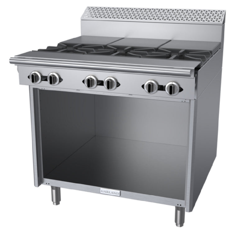 The Garland C36-15S Garland Cuisine Series Heavy Duty Range - gas, is a highly efficient cooking solution engineered for demanding culinary environments. This 36-inch range is equipped with three powerful 35,000 BTU open burners positioned at the front, ideal for high-intensity cooking tasks. Complementing these are three 15,000 BTU hot tops located at the rear, providing versatile cooking options to accommodate various culinary needs. The range features an open cabinet base, allowing for convenient storage of essential cooking tools and accessories. It is designed with a 7-inch high backguard, ensuring safety and cleanliness by protecting walls from heat and spills. The stainless steel construction on the front, sides, plate rail, and burner box not only enhances durability but also ensures easy maintenance and a professional appearance. With 6-inch adjustable legs, this range can be tailored to suit different working heights, providing comfort and efficiency in the kitchen. Boasting a total output of 150,000 BTU using natural gas (NG), the Garland C36-15S is certified by CSA Flame, CSA Star, and NSF, highlighting its compliance with stringent safety and sanitation standards, making it a reliable and versatile choice for restaurants and commercial kitchens demanding high performance and robust construction.