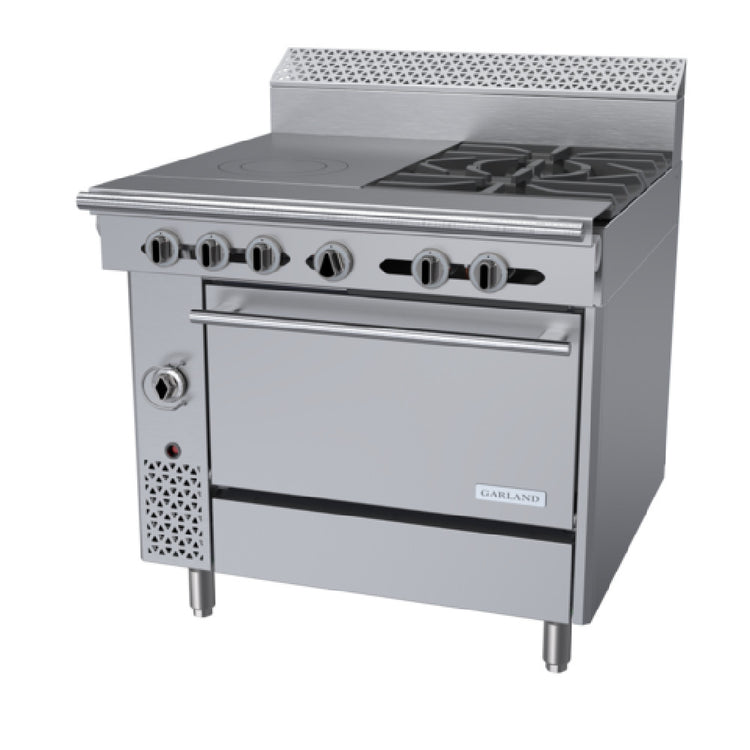 The Garland C36-17R Garland Cuisine Series Heavy Duty Range-Gas is a versatile and powerful cooking solution designed for demanding kitchen environments. Measuring 36 inches, this range features two robust 40,000 BTU open burners, ideal for high-intensity cooking tasks. Additionally, it includes an 18-inch front-fired hot top with removable lids and rings, providing flexibility for various cooking techniques. The standard oven design includes a single rack, catering to diverse baking needs. With a total output of 157,500 BTU, this range offers exceptional heat performance. Its construction showcases a stainless steel front, sides, plate rail, and burner box, ensuring durability and a sleek appearance. The adjustable 6-inch legs provide stability and adaptability to different kitchen setups. A 7-inch backguard enhances safety and cleanliness by catching spills and splatters. Certified by CSA Flame, CSA Star, and NSF, the Garland C36-17R meets stringent safety and sanitation standards. This heavy-duty range is an ideal choice for professional kitchens, offering a blend of efficiency, reliability, and compliance with industry standards.