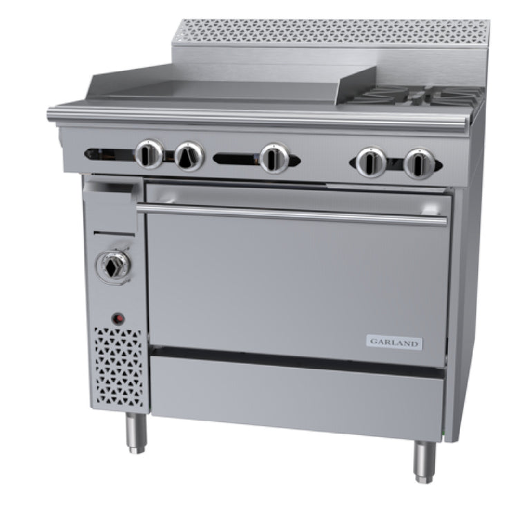 The Garland C36-2-1R Garland Cuisine Series Heavy Duty Range - Gas is a robust and versatile appliance designed for demanding culinary environments. Featuring a 36-inch structure, it is equipped with two powerful 35,000 BTU open burners positioned on the right, delivering exceptional heat for high-demand cooking tasks. On the left, a 24-inch griddle with a 1-inch thick steel plate provides even heat distribution, controlled precisely by thermostatic controls. This combination allows for a variety of culinary techniques, catering to diverse menu requirements. The unit includes a standard oven with one rack, offering additional cooking flexibility. The 7-inch backguard ensures safety and cleanliness by protecting surrounding surfaces. Constructed with a stainless steel front, sides, plate rail, and burner box, it ensures durability and ease of maintenance, essential for busy kitchen environments. The range stands on 6-inch adjustable legs, providing stability and adaptability to different kitchen layouts. With a total output of 170,000 BTU (NG) and certifications from CSA Flame, CSA Star, and NSF, this range meets high standards for safety and quality. The Garland C36-2-1R is an ideal solution for professional kitchens seeking reliability and performance under the rigors of heavy-duty cooking operations.