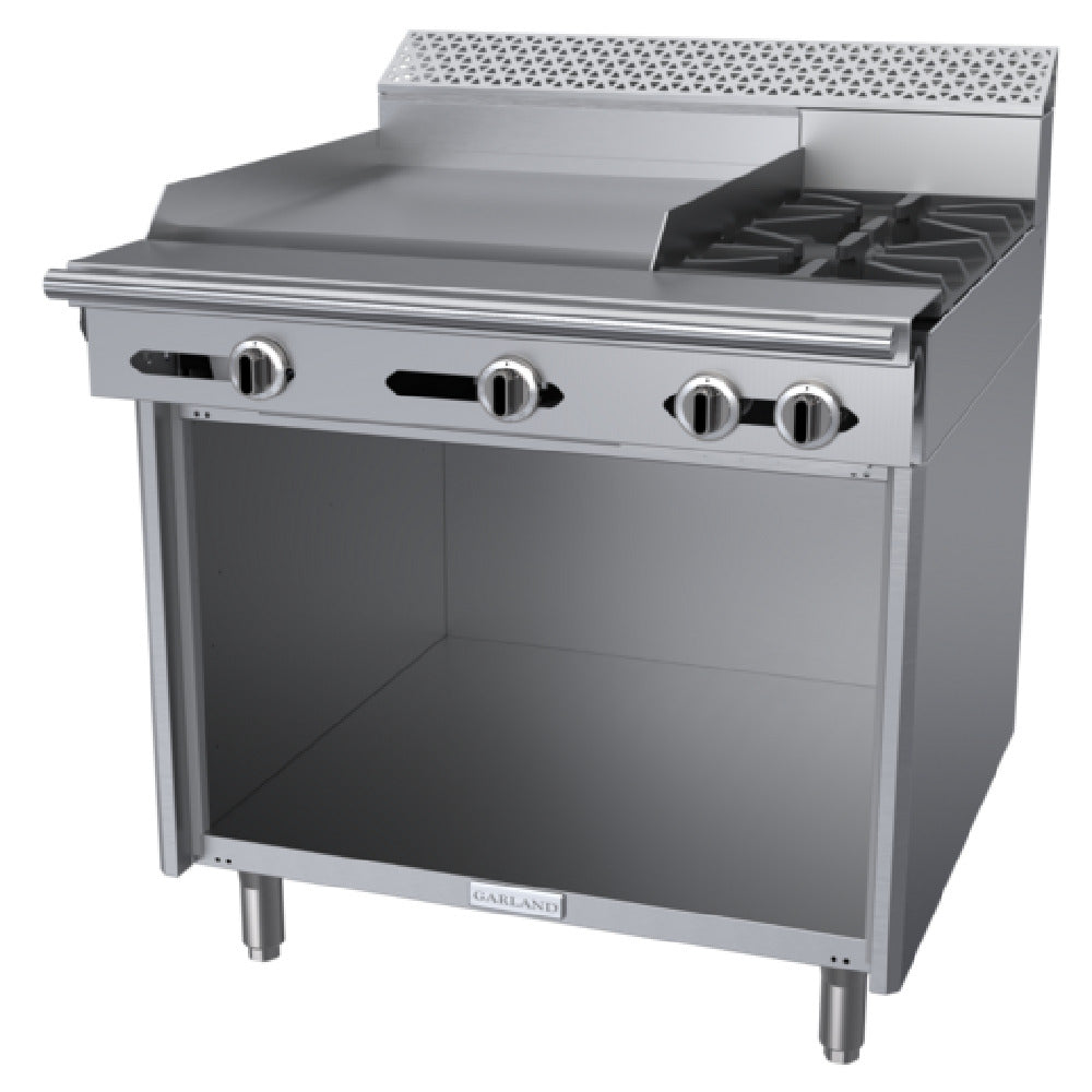 The Garland C36-2-1S Garland Cuisine Series Heavy Duty Range - Gas is a powerful appliance engineered for professional kitchens requiring robust cooking capabilities. This 36-inch gas range combines two high-performance 35,000 BTU open burners positioned on the right, alongside a versatile 24-inch griddle on the left. The griddle is crafted with a 1-inch thick steel plate and equipped with thermostatic controls, ensuring precise temperature management for diverse cooking tasks. The open cabinet base provides ample storage space for essential kitchen tools, enhancing workspace organization. The unit is designed with a 7-inch high backguard and boasts a stainless steel front, sides, plate rail, and burner box, embodying both durability and ease of cleaning. Its 6-inch adjustable legs offer stability on uneven surfaces, making it adaptable to various kitchen environments. With a total input of 130,000 BTU (Natural Gas), the range is certified by CSA Flame and CSA Star, along with NSF certification, assuring compliance with rigorous safety and sanitation standards. The Garland C36-2-1S is a reliable choice for foodservice establishments demanding efficiency and performance, offering a comprehensive solution for chefs and culinary professionals.