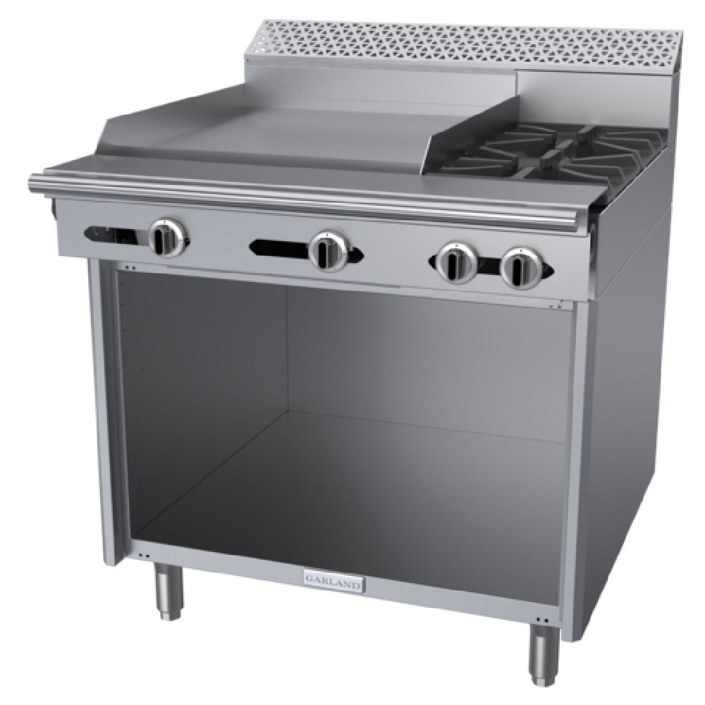 The Garland C36-2S Garland Cuisine Series Heavy Duty Range - gas - 36" is a robust cooking solution designed for commercial kitchens. It features two high-performance 35,000 BTU open burners on the right, ideal for precise cooking and high-heat applications. On the left, a substantial 24" griddle with a 1" thick steel plate provides even heat distribution, suitable for various cooking techniques. The range is controlled by Hi-Lo manual valve controls, allowing for meticulous adjustment of cooking temperatures. With an open cabinet base, this unit offers additional storage for kitchen essentials, enhancing operational efficiency. The 7" high backguard protects walls from splatters, maintaining cleanliness in a busy kitchen environment. The sturdy stainless steel construction on the front, sides, plate rail, and burner box ensures durability and longevity. The range stands on 6" adjustable legs, providing stability and accommodating uneven flooring. This model operates with a total output of 130,000 BTU when connected to natural gas (NG), certified by CSA Flame and CSA Star, and meets NSF safety standards. The Garland C36-2S is a versatile choice for diverse culinary applications, offering reliability and performance to various segments within the food service industry.