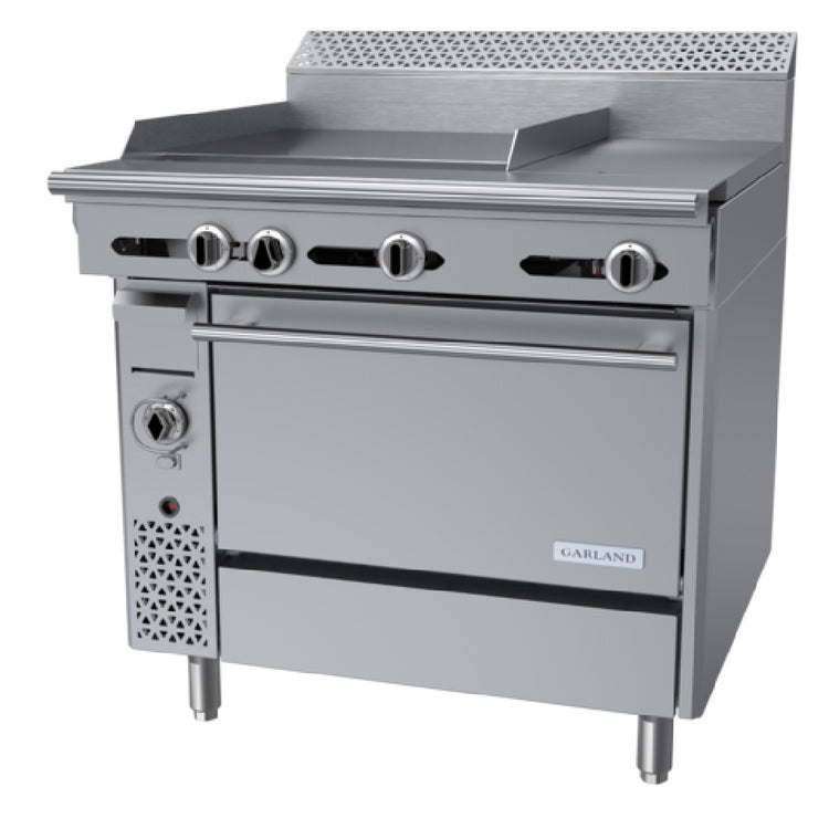 The Garland C36-3C Garland Cuisine Series Heavy Duty Range is a robust 36-inch gas range designed for demanding commercial kitchens. Featuring a 24-inch griddle positioned on the left side, it boasts a thick 1-inch steel plate for consistent heat distribution, managed by Hi-Lo manual valve controls. On the right, a 12-inch even heat hot top ensures versatile cooking solutions. The range includes a convection oven equipped with three racks for increased baking capacity. A 7-inch backguard adds a measure of safety and cleanliness, while the stainless steel front, sides, plate rail, and burner box provide durability and a professional aesthetic. The range stands on 6-inch adjustable legs, offering flexibility in installation and use. With an impressive 122,000 BTU (Natural Gas) output, the range meets high-demand cooking needs. It operates on 120V/60/1-ph with a 1/3 HP motor and 0.6 amps, using a NEMA 5-15P plug. Certified by CSA Flame, CSA Star, and NSF, this range adheres to strict safety and performance standards, making it a reliable choice for various market segments within the food service industry. Its combination of power, versatility, and compliance makes it a valuable asset for professional kitchens.