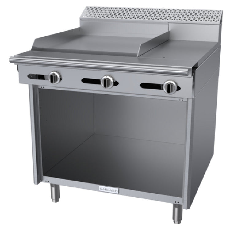 The Garland C36-3S Garland Cuisine Series Heavy Duty Range Gas 36" is a versatile and robust kitchen appliance that stands out in the commercial culinary equipment market. This heavy-duty range features a 36-inch width, accommodating a comprehensive cooking setup. Notably, it includes a 24-inch griddle positioned on the left, constructed with a 1-inch thick steel plate for durability and even heat distribution. The griddle's Hi-Lo manual valve controls offer precise temperature management, essential for achieving optimal cooking results. Complementing the griddle, the right side of this range is equipped with a 12-inch even heat hot top, designed for consistent cooking performance. The open cabinet base provides convenient storage space, enhancing kitchen efficiency. The unit is crafted with a stainless steel front, sides, plate rail, and burner box, ensuring both durability and easy maintenance. The 7-inch high backguard offers added protection during operation. Moreover, the range is supported by 6-inch adjustable legs, allowing for customization to match kitchen surfaces. With a powerful output of 85,000 BTU, the Garland C36-3S is certified by CSA Flame, CSA Star, and NSF, highlighting its adherence to safety and quality standards. This range is an excellent choice for diverse culinary environments, offering a blend of performance, reliability, and adaptability.
