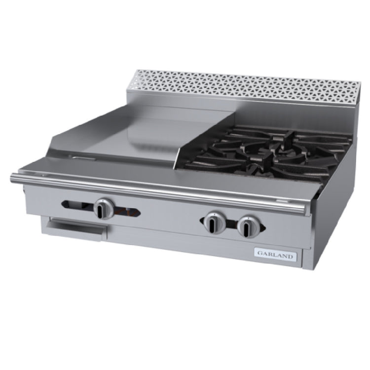 The Garland C36-4-1M Garland Cuisine Series Heavy Duty Range Gas is a versatile and powerful appliance designed for professional kitchens that demand efficiency and precision. This 36-inch modular top range features a combination of two 40,000 BTU open burners on the right side, providing high-performance cooking capabilities for various culinary applications. Complementing the burners, an 18-inch griddle is positioned on the left, constructed with a 1-inch thick steel plate for superior heat retention and even cooking. The thermostatic controls enhance precision, ensuring consistent temperature management for both the burners and griddle. The range boasts a robust 110,000 BTU (NG) output, making it suitable for high-volume cooking environments. Its durability is underscored by stainless steel construction on the front, sides, plate rail, and burner box, while a 7-inch high backguard adds an extra layer of safety and cleanliness. Certified by CSA Flame, CSA Star, and NSF, this range meets rigorous safety and sanitation standards. The Garland C36-4-1M is ideally suited for restaurants and food service establishments looking to optimize their cooking space with a high-performing, reliable range that supports diverse culinary tasks with precision and efficiency.