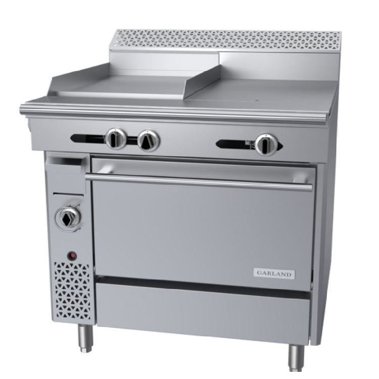 The Garland C36-5-1R Garland Cuisine Series Heavy Duty Range - Gas is a versatile and robust cooking solution designed for demanding kitchen environments. This gas-powered range features a spacious 36-inch cooktop that incorporates a dedicated 18-inch griddle on the left side, crafted from a 1-inch thick steel plate for optimal heat retention and distribution. Complementing the griddle is an 18-inch even heat hot top on the right, offering chefs the ability to handle a variety of cooking tasks simultaneously. The range is equipped with thermostatic controls, allowing precise temperature management for consistent culinary results. Additionally, it includes a standard oven outfitted with one rack, ideal for baking and roasting needs. The design is completed with a 7-inch high backguard and constructed with stainless steel front, sides, plate rail, and burner box, ensuring durability and easy maintenance. The range's 6-inch adjustable legs provide stability on uneven surfaces. Operating at 102,500 BTU (NG), it meets CSA Flame, CSA Star, and NSF certifications, highlighting its safety and quality standards. The Garland C36-5-1R is suited for various market segments, including restaurants and catering businesses, offering reliable and efficient performance for high-volume cooking operations.