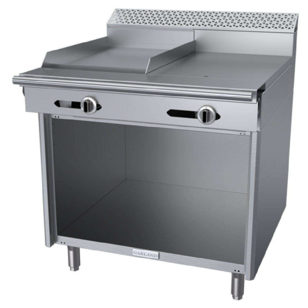 The Garland C36-5-1S Garland Cuisine Series Heavy Duty Range Gas is a professional-grade kitchen appliance tailored for demanding culinary environments, characterized by its robust design and versatile cooking capabilities. This 36-inch range is crafted with precision, featuring a single 18-inch griddle on the left, constructed from a 1-inch thick steel plate, and equipped with thermostatic controls for precise temperature management. On the right, the range includes an 18-inch even heat hot top, facilitating diverse cooking needs. The open cabinet base offers convenient storage, while the 7-inch backguard ensures safety and cleanliness. With a stainless steel front, sides, plate rail, and burner box, the range is both durable and aesthetically pleasing. Supported by 6-inch adjustable legs, it can be tailored to fit various kitchen setups. Delivering a powerful 62,500 BTU output, this range is CSA Flame and CSA Star certified, ensuring adherence to high safety and performance standards. Additionally, it holds an NSF certification, attesting to its compliance with public health requirements. The Garland C36-5-1S is an ideal solution for kitchens requiring a combination of griddle and hot top functionalities, underpinned by reliable performance and quality construction.