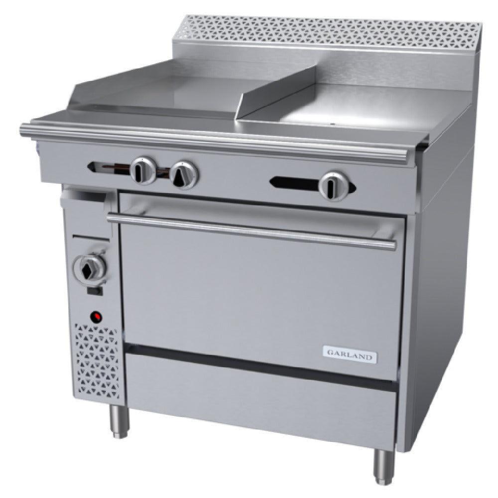 The Garland C36-5C Garland Cuisine Series Heavy Duty Range - gas, 36" is engineered for high-performance culinary operations, providing both versatility and durability in professional kitchens. This robust range features an 18" griddle with a 1" thick steel plate on the left, perfect for precise temperature control and consistent cooking results. Complementing this is an 18" even heat hot top on the right, enhancing the unit’s utility for varied cooking needs. It includes a convection oven with three racks, facilitating efficient baking and roasting capabilities. The unit boasts a 7"H backguard for added safety and a stainless steel construction for the front, sides, plate rail, and burner box, ensuring longevity and ease of cleaning. Its 6" adjustable legs offer customization for different kitchen setups. Operating at 99,500 BTU (NG) and 120V/60/1-ph, this range is powered by a 1/3HP motor drawing 0.6 amps, and is equipped with a NEMA 5-15P plug. Certified by CSA Flame, CSA Star, and NSF, the Garland C36-5C meets rigorous safety and sanitation standards, making it an indispensable asset for restaurants, catering services, and other food service establishments seeking reliable performance and construction.