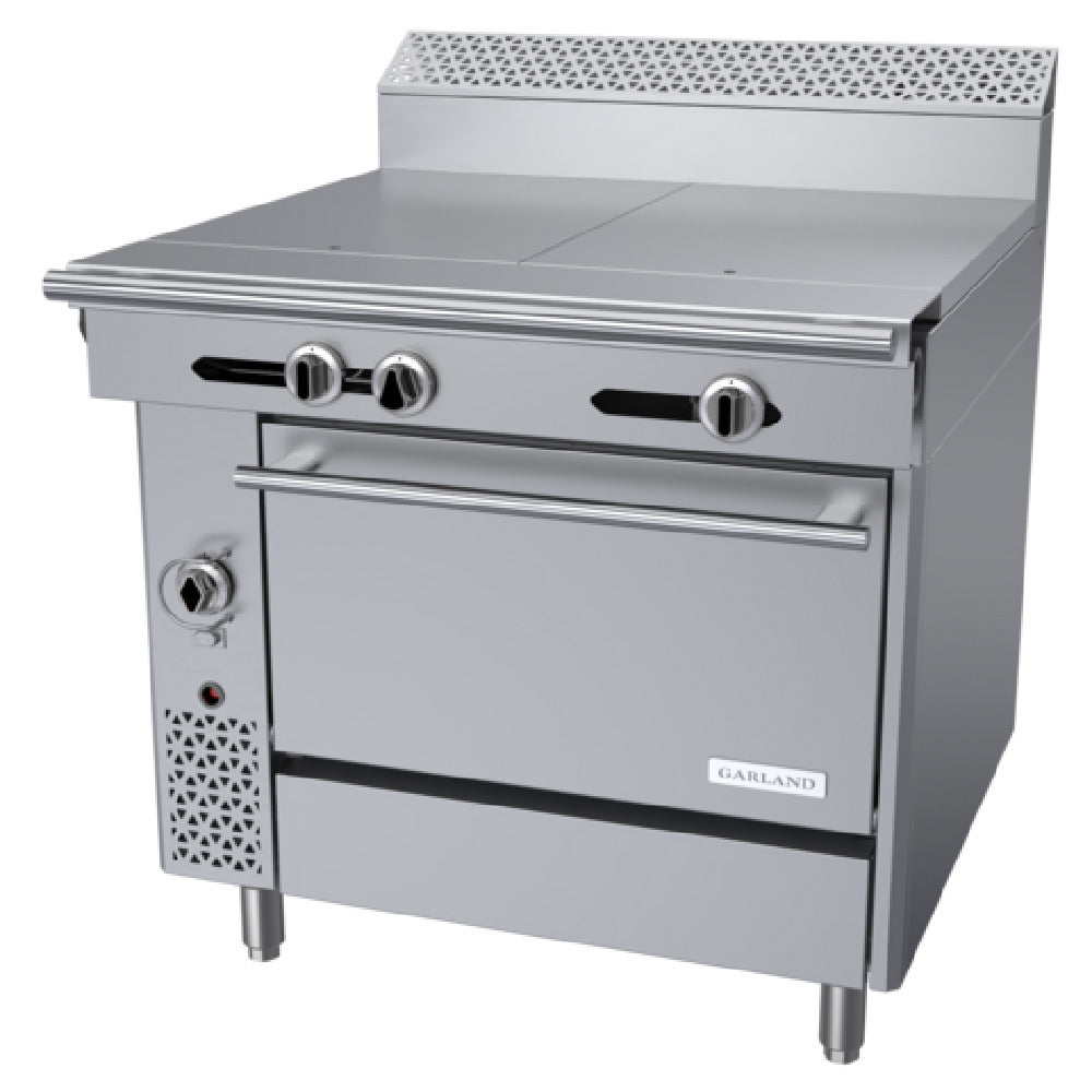 The Garland C36-9C Garland Cuisine Series Heavy Duty Range Gas 36" is a versatile and robust cooking appliance designed for demanding professional kitchens. Featuring two 18-inch even heat hot tops, this range ensures consistent cooking performance across its surface. The convection oven component includes three racks, providing ample space for simultaneous baking and roasting tasks. The unit is equipped with a 7-inch high backguard and constructed with a durable stainless steel front, sides, plate rail, and burner box, ensuring longevity and ease of cleaning. Standing on 6-inch adjustable legs, the range can be tailored to fit seamlessly into any kitchen setup. With a high heat output of 102,000 BTU (Natural Gas), it is capable of meeting the rigorous demands of a busy kitchen environment. The range operates on a 120V/60/1-ph electrical system, drawing a modest 0.6 Amps, and is equipped with a NEMA 5-15P cord and plug for convenient installation. Recognized by CSA Flame, CSA Star, and NSF, the Garland C36-9C meets stringent safety and sanitation standards, making it an excellent choice for a wide range of culinary and food service applications, from small restaurants to large-scale catering facilities.