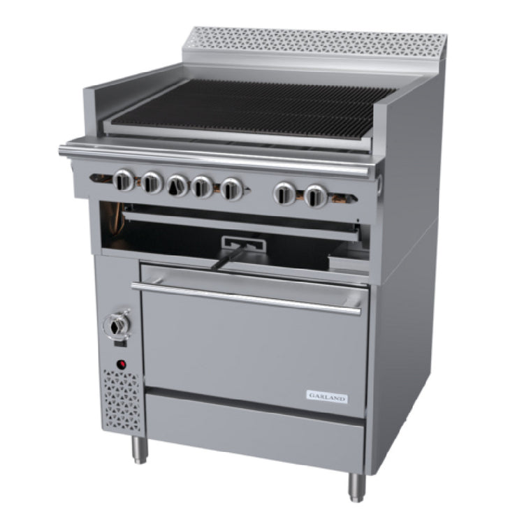 The Garland C36-ARC Garland Cuisine Series Heavy Duty Range is a versatile and powerful gas-operated kitchen appliance designed for high-demand cooking environments. This 36-inch range features a charbroiler and an underfired broiler, offering versatility in cooking methods. It is equipped with robust cast iron radiants and adjustable top grates, ensuring durability and flexibility for various culinary tasks. The range includes a convection oven with three racks, providing ample space for baking or roasting. The exterior is constructed with stainless steel, including the stub-back, front, sides, front rail, and burner box, ensuring long-lasting durability and easy maintenance. Supporting seamless operation, it stands on 6-inch adjustable legs for stability on uneven surfaces. The range operates on a 1/3 HP motor using 120V/60/1-ph power, drawing 0.6 amps, with a NEMA 5-15P plug configuration, delivering a powerful output of 145,000 BTU (NG). Certified by CSA Flame, CSA Star, and NSF, this range meets rigorous safety and performance standards. The Garland C36-ARC is an ideal choice for professional kitchens across various market segments that demand reliability, efficiency, and top-tier cooking capabilities.