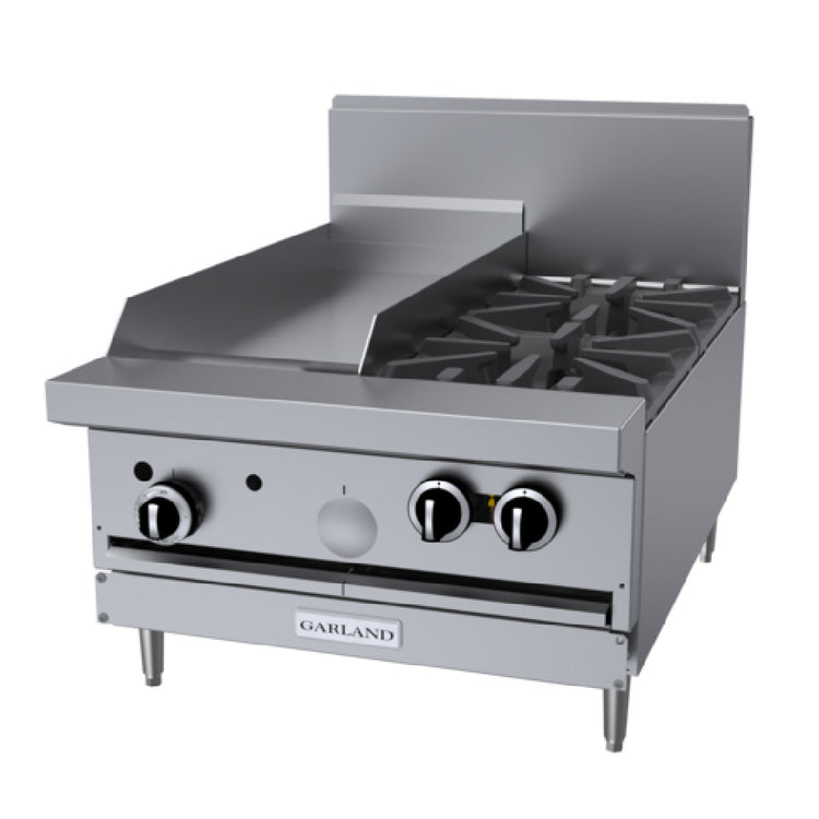 The Garland G24-2G12T_LP G Starfire Pro Series Restaurant Range is a versatile and powerful gas range well-suited for diverse culinary environments. This modular unit measures 24 inches, making it an efficient choice for kitchens where space optimization is crucial. It is equipped with two high-performance 33,000 BTU open burners, delivering robust heat for various cooking requirements. Complementing the burners is a 12-inch griddle featuring a 5/8-inch smooth steel plate, which provides a consistent cooking surface for a wide range of recipes. The range's construction includes durable cast iron top and ring grates, enhancing its longevity and heat retention capabilities. Additionally, the unit features a stainless steel front, sides, and plate rail, ensuring resilience and easy cleaning. Its low profile back guard offers added protection while maintaining a sleek appearance. With a total output of 84,000 BTU, this restaurant range is certified by CSA Flame, CSA Star, and cCSAus, and meets NSF standards, underscoring its reliability and safety in commercial kitchen settings. Whether used in bustling restaurants or smaller culinary establishments, the Garland G24-2G12T_LP G Starfire Pro Series delivers exceptional cooking performance and durability.