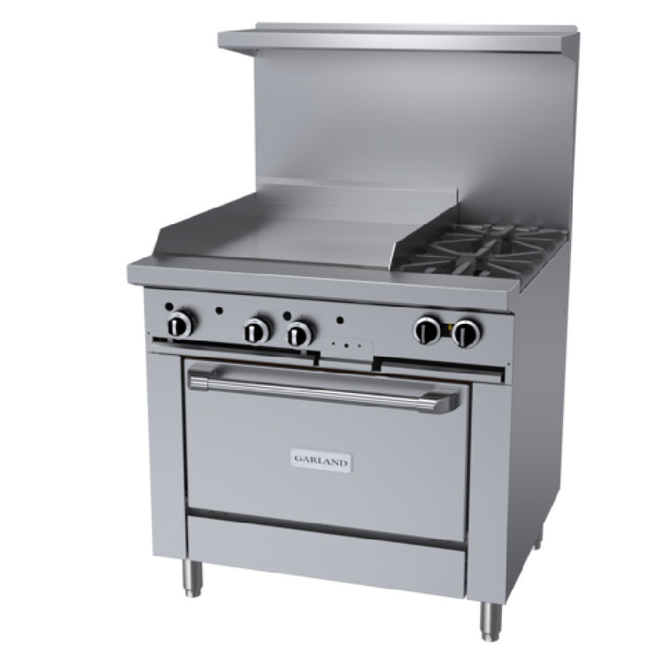 The Garland G36-2G24R_LP G Starfire Pro Series Restaurant Range is a versatile gas-powered cooking appliance tailored for professional kitchens, measuring 36 inches in width. It features two high-performance open burners, each delivering 33,000 BTUs, catering to demanding culinary environments that require robust heating capabilities. Additionally, a 24-inch griddle with a 5/8-inch thick smooth steel plate complements the cooking surface, ideal for a range of cooking techniques. The range includes cast iron top and ring grates, ensuring durability and heat retention. A standard oven with an included rack and three-position rack guides provides flexible baking options, accommodating diverse culinary needs. The unit's stainless steel construction extends to the front, sides, plate rail, two-piece back guard, and shelf, promoting durability and ease of cleaning. Adjustable feet on the 6-inch stainless steel legs ensure stability on uneven surfaces. With a total output of 140,000 BTUs, the Garland range is designed for efficiency and reliability. It carries CSA Flame and CSA Star certifications, as well as cCSAus and NSF approvals, affirming its compliance with industry standards. This restaurant range is an asset for food service establishments seeking a robust, multifaceted cooking solution.