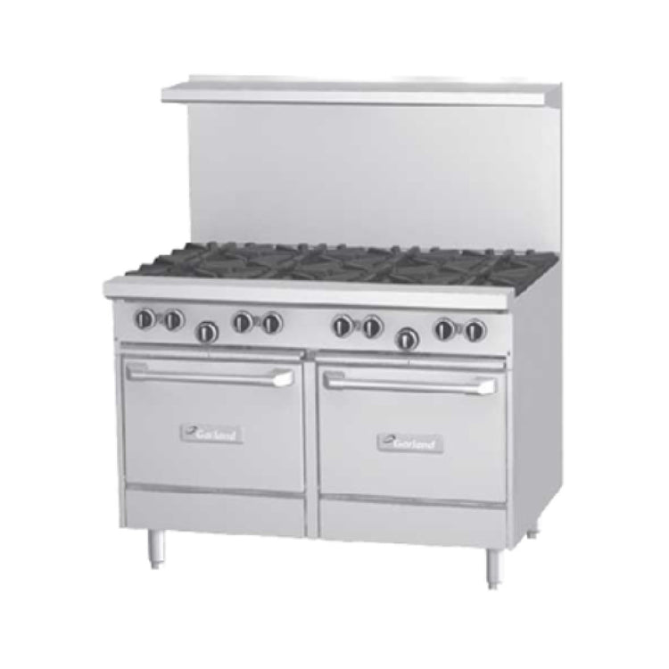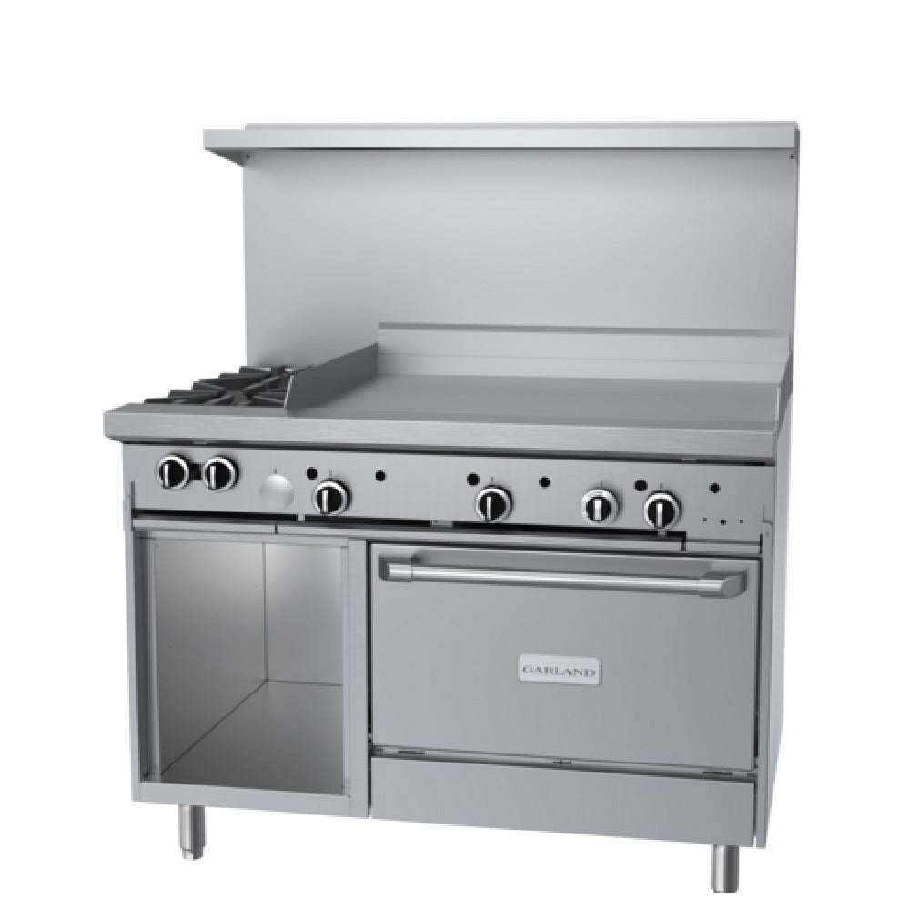 The Garland G48-2G36RS_NAT G Starfire Pro Series Restaurant Range is a high-performance gas range, measuring 48 inches wide, that is engineered for demanding culinary environments. This unit features two powerful 33,000 BTU open burners with durable cast iron top and ring grates, ensuring consistent heat distribution for efficient cooking. Additionally, it includes a 36-inch griddle equipped with a 5/8-inch thick smooth steel plate, offering a versatile cooking surface for various dishes. Beneath the cooking surfaces, the range provides a standard oven complete with three-position rack guides and an oven rack, allowing for customized baking configurations. Complementing the oven, there is a storage base, optimizing kitchen space for convenience. The robust construction is highlighted by a stainless steel front, sides, plate rail, 2-piece back guard, and shelf, all supported by adjustable 6-inch stainless steel legs for stability. With a total output of 158,000 BTU, this restaurant range is certified by CSA Flame, CSA Star, cCSAus, and NSF, affirming its compliance with rigorous safety and performance standards. The Garland G Starfire Pro Series is an ideal choice for professional kitchens requiring a reliable, versatile, and efficient range solution.