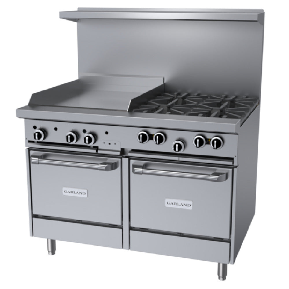 The Garland G48-4G24LL_NAT G Starfire Pro Series Restaurant Range is a versatile and powerful appliance designed for commercial kitchens demanding high performance and efficiency. This 48-inch gas range features four open burners, each delivering a robust 33,000 BTU output, ensuring rapid heating and cooking precision. The cast iron top and ring grates provide durability and long-lasting performance under rigorous conditions. Complementing the burners is a 24-inch griddle, equipped with a 5/8-inch thick smooth steel plate, ideal for versatile cooking applications. The unit includes two space-saver ovens, each fitted with a rack and three-position rack guides, allowing for optimized cooking and baking options. Constructed with a stainless steel front, sides, and plate rail, this range also features a two-piece back guard and shelf for added convenience. The 6-inch stainless steel legs with adjustable feet ensure stability and adaptability to various kitchen layouts. Operating at a total of 232,000 BTUs, this range is certified by CSA Flame, CSA Star, and cCSAus, as well as ANSI/NSF standards, ensuring safety and quality. The Garland G48-4G24LL_NAT is an ideal choice for restaurants and culinary establishments seeking a reliable and efficient cooking solution.