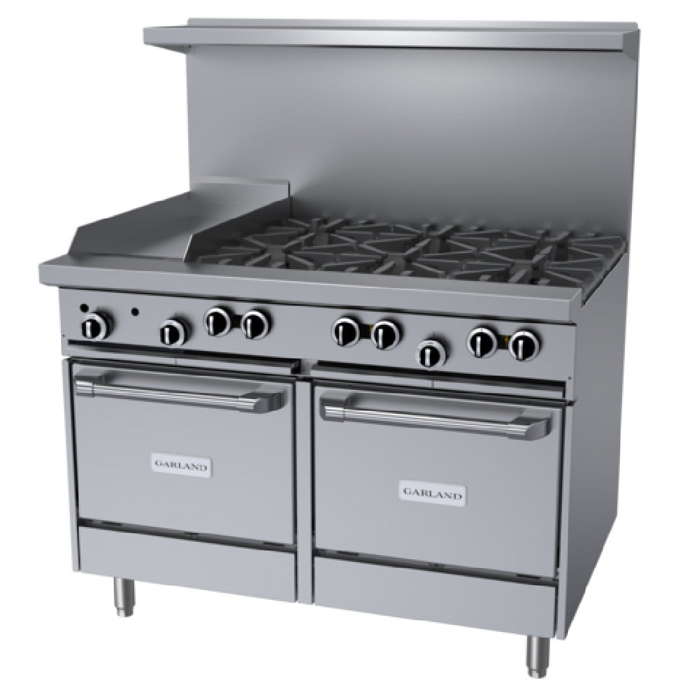 The Garland G48-6G12LL_LP G Starfire Pro Series Restaurant Range is a versatile and powerful kitchen appliance designed for high-demand commercial settings. This 48-inch gas range features six robust 33,000 BTU open burners, providing ample heat for various cooking requirements. Its cast iron top and ring grates ensure durability and optimal heat distribution. The range also includes a 12-inch griddle with a 5/8-inch thick smooth steel plate, perfect for griddling tasks. For baking and roasting, the unit is equipped with two space saver ovens, each featuring three-position rack guides and one rack per oven, maximizing cooking flexibility. The oven's total output is an impressive 280,000 BTU, ensuring efficient and consistent performance. Constructed with a stainless steel front, sides, plate rail, and a two-piece back guard and shelf, this range promises resilience and ease of maintenance. The 6-inch stainless steel legs with adjustable feet provide stability and adaptability for various kitchen configurations. Certified by CSA Flame, CSA Star, cCSAus, and NSF, the Garland G48-6G12LL_LP guarantees compliance with safety and sanitation standards, making it an essential addition to any professional kitchen environment.