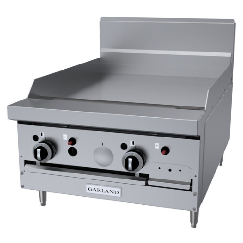 The Garland GF24-G24T_LP GF Starfire Pro Series Restaurant Range is a premier choice for culinary professionals demanding precision and reliability in their kitchen operations. This modular 24-inch gas range is equipped with a griddle featuring a 5/8-inch smooth steel plate, ensuring consistent heat distribution and superior cooking performance. It offers snap action and modulating thermostat control, allowing chefs to adjust temperatures between 175°F to 425°F with ease. The unit is designed with a flame failure feature and boasts high efficiency with a power output of 36,000 BTU. The robust construction includes a stainless steel front, sides, and plate rail, accompanied by a low profile back guard, making it both durable and stylish. The 4-inch adjustable legs ensure stability on any kitchen floor. Certified by CSA Flame, CSA Star, cCSAus, CE, and NSF, this restaurant range meets stringent safety and performance standards, making it suitable for various markets, including restaurants, hotels, and catering services. Its precise controls and durable design cater to establishments that prioritize exact cooking temperatures and reliability in their culinary endeavors.