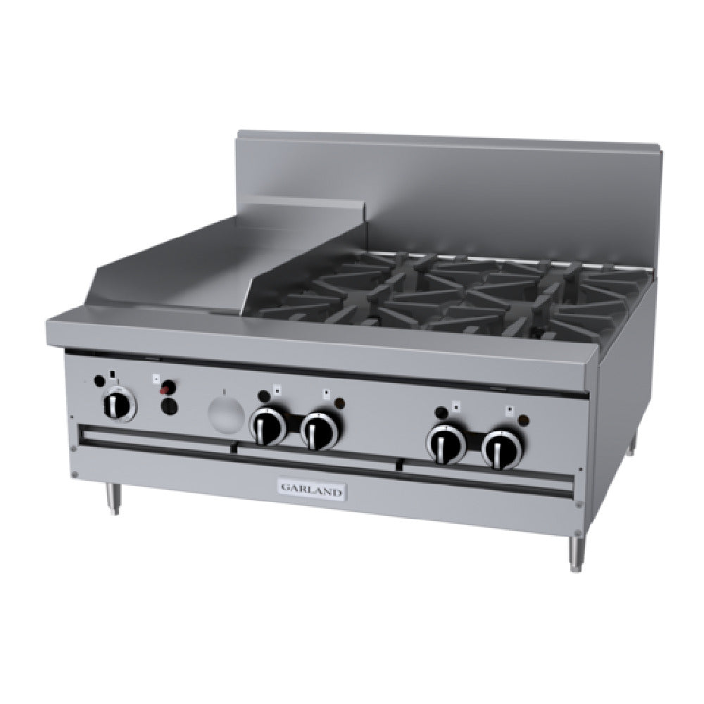 The Garland GF36-4G12T_NAT GF Starfire Pro Series Restaurant Range is a versatile cooking solution designed for demanding commercial kitchens. This 36-inch modular gas range combines power and precision with its four 26,000 BTU open burners and a 12-inch griddle, making it suitable for a variety of cooking tasks. The griddle features a 5/8-inch thick smooth steel plate, providing even heat distribution for optimal cooking results. The range is equipped with manual hi/lo valve control, allowing chefs to adjust the heat with precision. The cast iron top and ring grates are durable and heat-retentive, ensuring consistent performance. Safety is a priority with the inclusion of a flame failure feature. The range's robust construction is highlighted by its stainless steel front, sides, plate rail, and a 10-inch low profile back guard, all contributing to its durability and ease of maintenance. It stands on 4-inch stainless steel legs with adjustable feet for stability on any kitchen surface. The unit operates at a total of 122,000 BTU and holds certifications from CSA Flame, CSA Star, cCSAus, CE, and NSF, underscoring its compliance with stringent safety and quality standards. This restaurant range is an excellent choice for industrial, institutional, and high-volume restaurant settings.