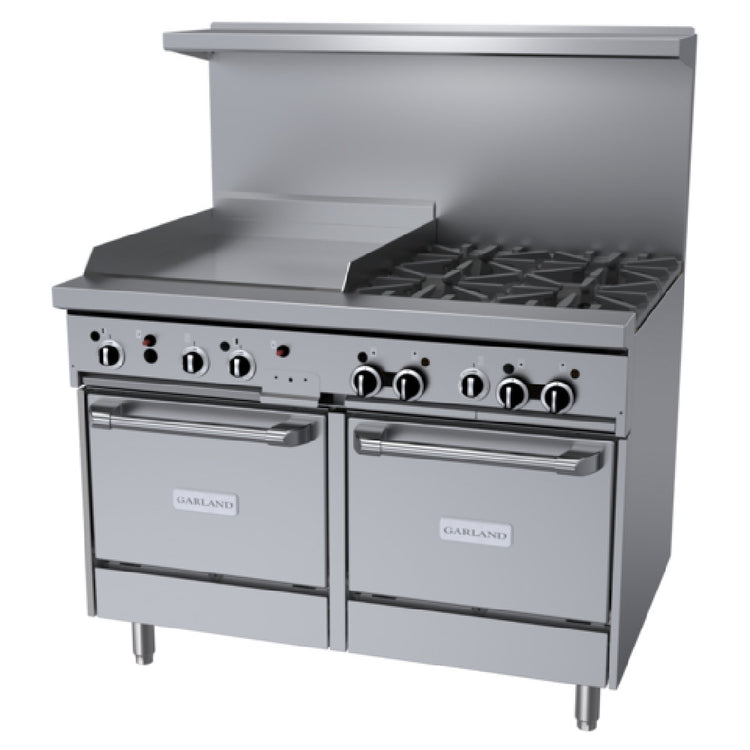The Garland GF48-4G24LL_LP GF Starfire Pro Series Restaurant Range is a gas-powered culinary powerhouse, meticulously crafted for professional kitchens demanding precision and efficiency. With its expansive 48-inch width, this range boasts four robust 26,000 BTU open burners, each equipped with cast iron top and ring grates for exceptional heat distribution and durability. Complementing these burners is a 24-inch griddle featuring a 5/8-inch thick smooth steel plate, governed by thermostatic controls to ensure precise temperature management. The range is fortified with flame failure protection for enhanced safety. It includes two space saver ovens, each fitted with three-position rack guides and accompanied by a single rack, optimizing cooking versatility. The stainless steel construction is evident across the front, sides, plate rail, and 10-inch low-profile back guard, ensuring both resilience and aesthetic appeal. Supported by six-inch stainless steel legs with adjustable feet, the range stands sturdy and adaptable. With an impressive total output of 204,000 BTU, this model is CSA Flame, CSA Star, cCSAus, CE, and NSF certified, affirming its compliance with rigorous industry standards. The Garland GF48-4G24LL_LP is an indispensable asset for varied market segments, offering unmatched performance in the bustling environment of modern restaurants.