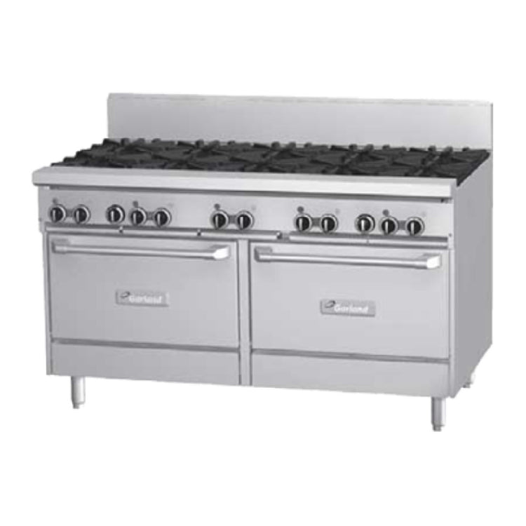 The Garland GF60-10RR_NAT GF Starfire Pro Series Restaurant Range is a gas-powered culinary powerhouse, meticulously designed for professional kitchens. This 60-inch unit is equipped with ten robust 26,000 BTU open burners, each featuring cast iron top and ring grates, ensuring consistent heat distribution and durability for demanding cooking tasks. The inclusion of flame failure safety devices underscores its commitment to user safety, preventing gas flow if the flame is accidentally extinguished. This restaurant range boasts two standard ovens, each with a 3-position rack guide and an oven rack, providing ample flexibility for diverse baking and roasting needs. The stainless steel construction on the front, sides, and plate rail, along with a 10-inch low-profile back guard, ensures both longevity and ease of cleaning, making it a reliable choice for high-volume environments. Standing on 6-inch stainless steel legs with adjustable feet, the unit offers stability and adaptability to various kitchen layouts. With a total energy output of 336,000 BTU, the Garland GF60-10RR_NAT is CSA Flame, CSA Star, cCSAus, CE, and NSF certified, reflecting its adherence to stringent safety and performance standards. This professional-grade range is a pivotal tool for chefs requiring precision, efficiency, and reliability in their culinary endeavors.